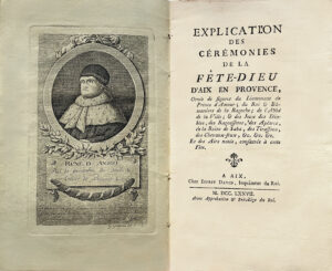 „Dieses Werk stammt von Gaspard Grégoire, gebürtig aus Aix. Die Figuren wurden von Paul Grégoire, einem seiner Söhne, gezeichnet und von Gaspard, Pauls Bruder, gestochen. Es sind diese beiden Söhne Grégoire, die die Erfinder der Samtmalerei sind.” (Barbier, anonyme, III, 378).Eingeführt von König René [titular König von Neapel (1435-1480)], ist die Fête-Dieu eines der populärsten, originellsten und malerischsten Feste in der Provence; es wurde immer in Aix abgehalten und mit größter Begeisterung und Pracht gefeiert; seine naiven Riten wurden immer mit größtem Respekt gewahrt. Es war ursprünglich ein Turnier, das am Montag nach Pfingsten mit der Ernennung von Offizieren oder Rittern eröffnet wurde, von denen die wichtigsten der Leutnant des Fürsten der Liebe, der Abt der Stadt und der König von La Basoche waren; es dauerte bis zum Samstag nach der Fête-Dieu” (Mour).Das Interesse an diesem Buch ist so groß, dass 1978 in Marseille eine Faksimile-Ausgabe erstellt wurde.