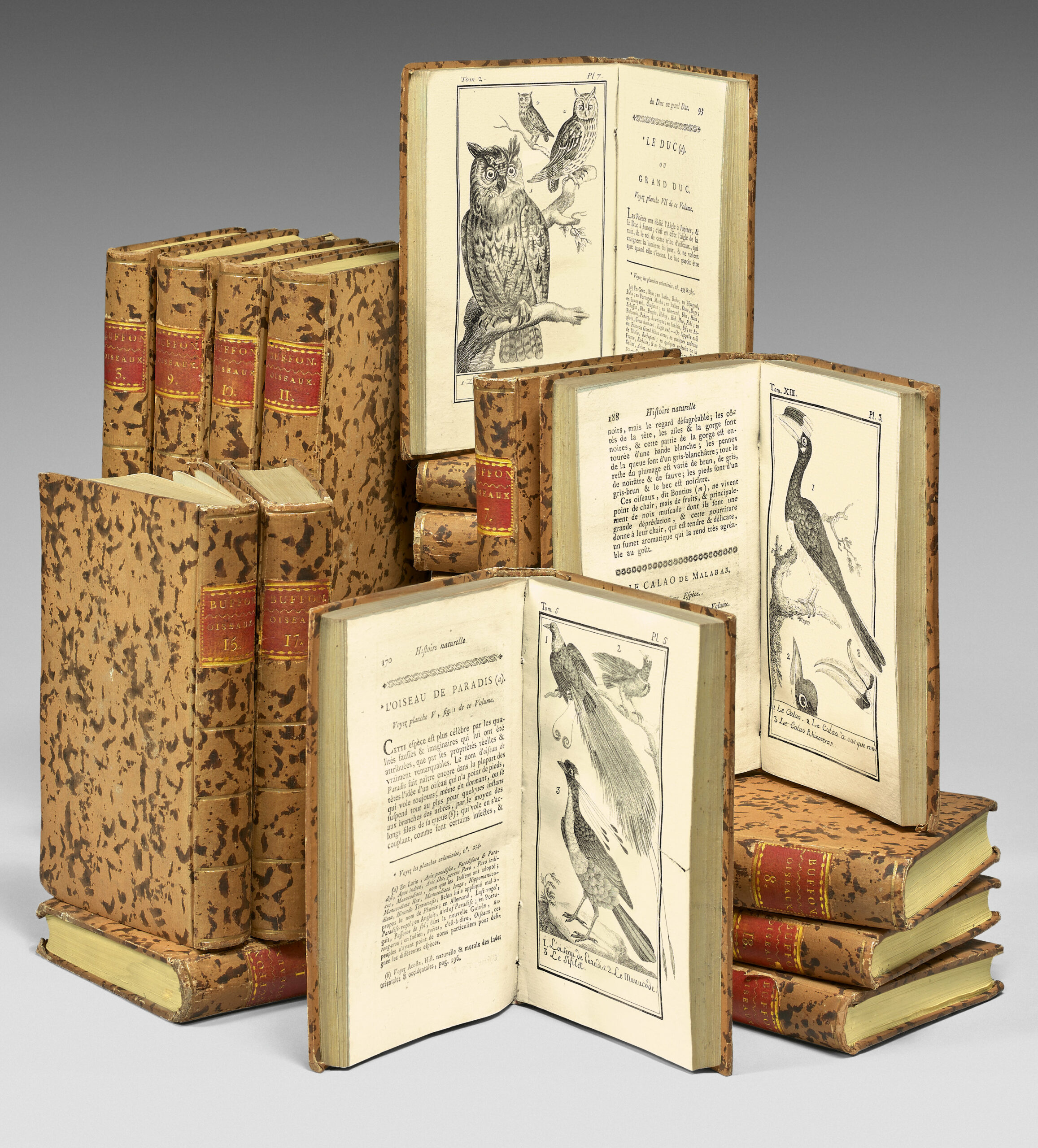 Komplettsammlung der 18 Vogelbände, die in dieser Ausgabe von 1785-1787 erschienen sind und mit 114 Tafeln von Vögeln verziert sind.Dieses Hauptwerk von Buffon brachte ihm Bewunderung in ganz Europa und eine Berühmtheit, die der von Voltaire und Rousseau gleichkam.