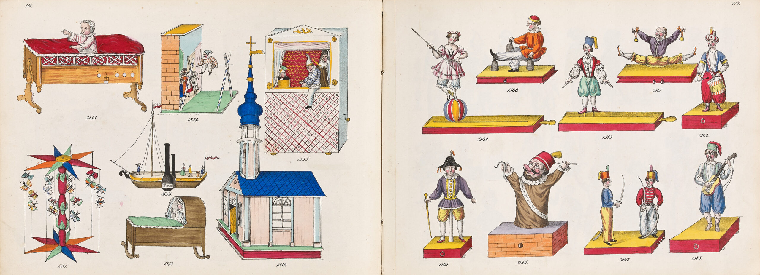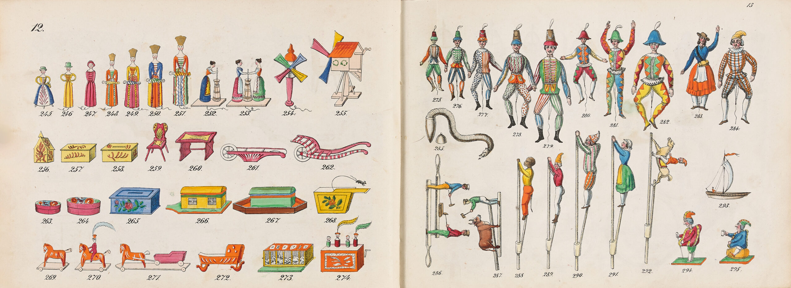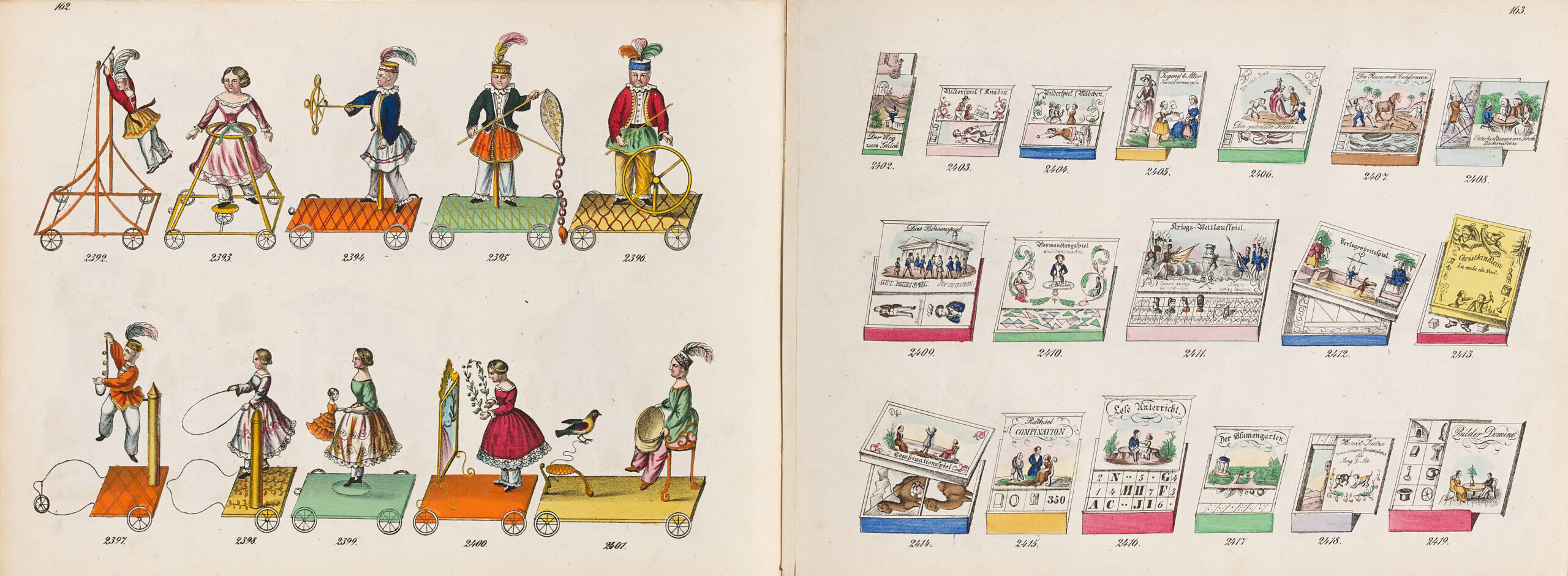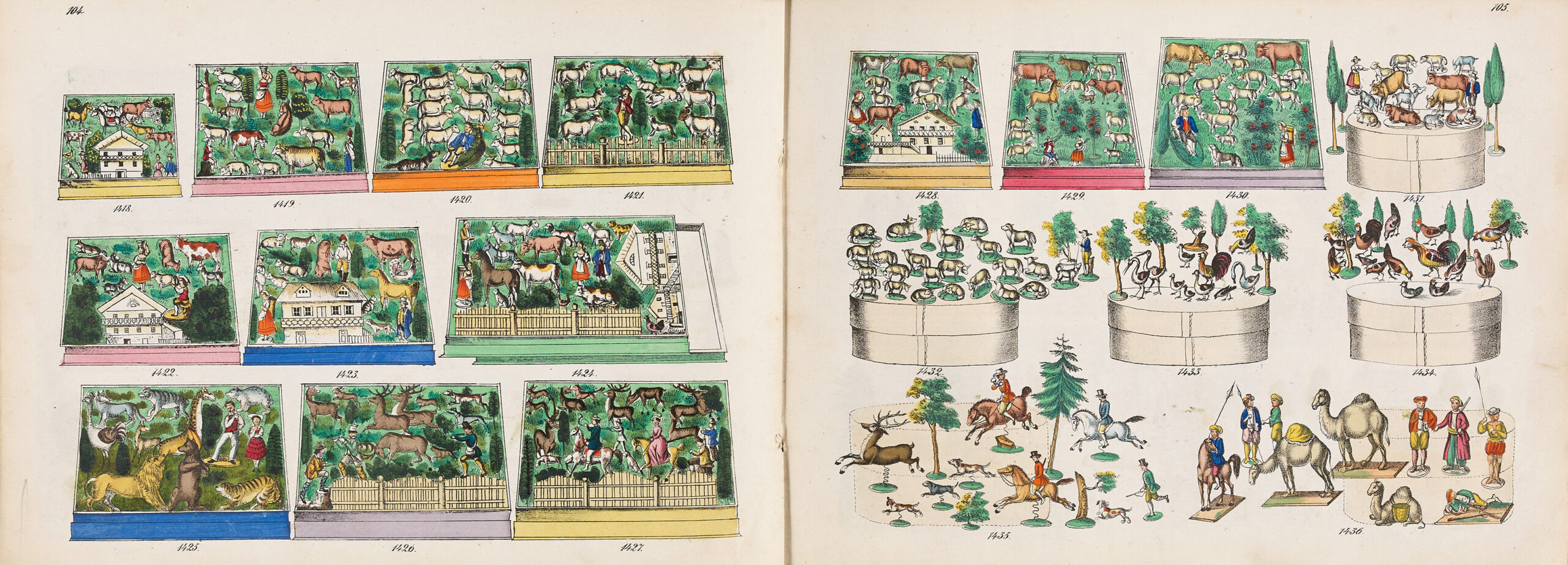 Die Spielwaren werden ohne Angaben von Zeichner und Drucker und ohne Preisangaben präsentiert.Illustriert mit 2546 bunten Bildern von Spielwaren, darunter Tiere, Instrumente, Kindermöbel, Häuser, Kutschen usw., alle mit feiner zeitgenössischer Handkolorierung, teilweise mit Gold oder Silber hervorgehoben.Die Artikelnummern sind lithographiert und einige der Objekte sind in verschiedenen Größen verfügbar.