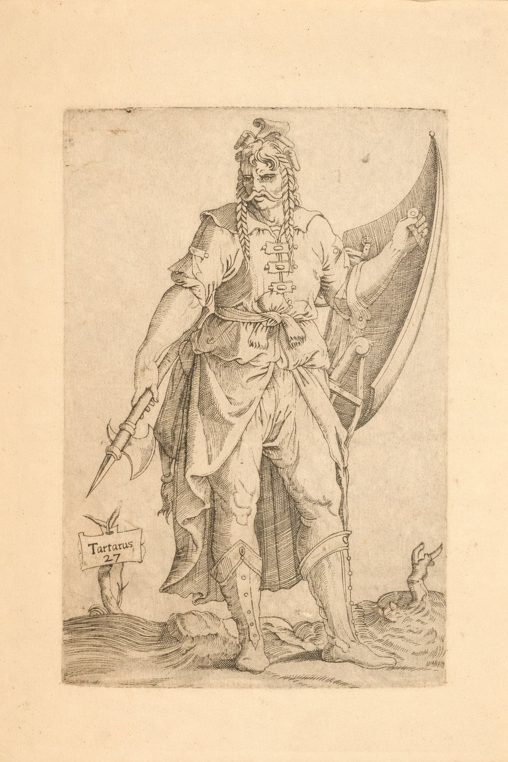 Diese Tafeln, etwa 155 x 105 mm, zeigen jeweils eine männliche oder weibliche Figur in einem Rahmen. Ein zu einer Astgabel aufgehängtes Holzschild trägt die Legende.