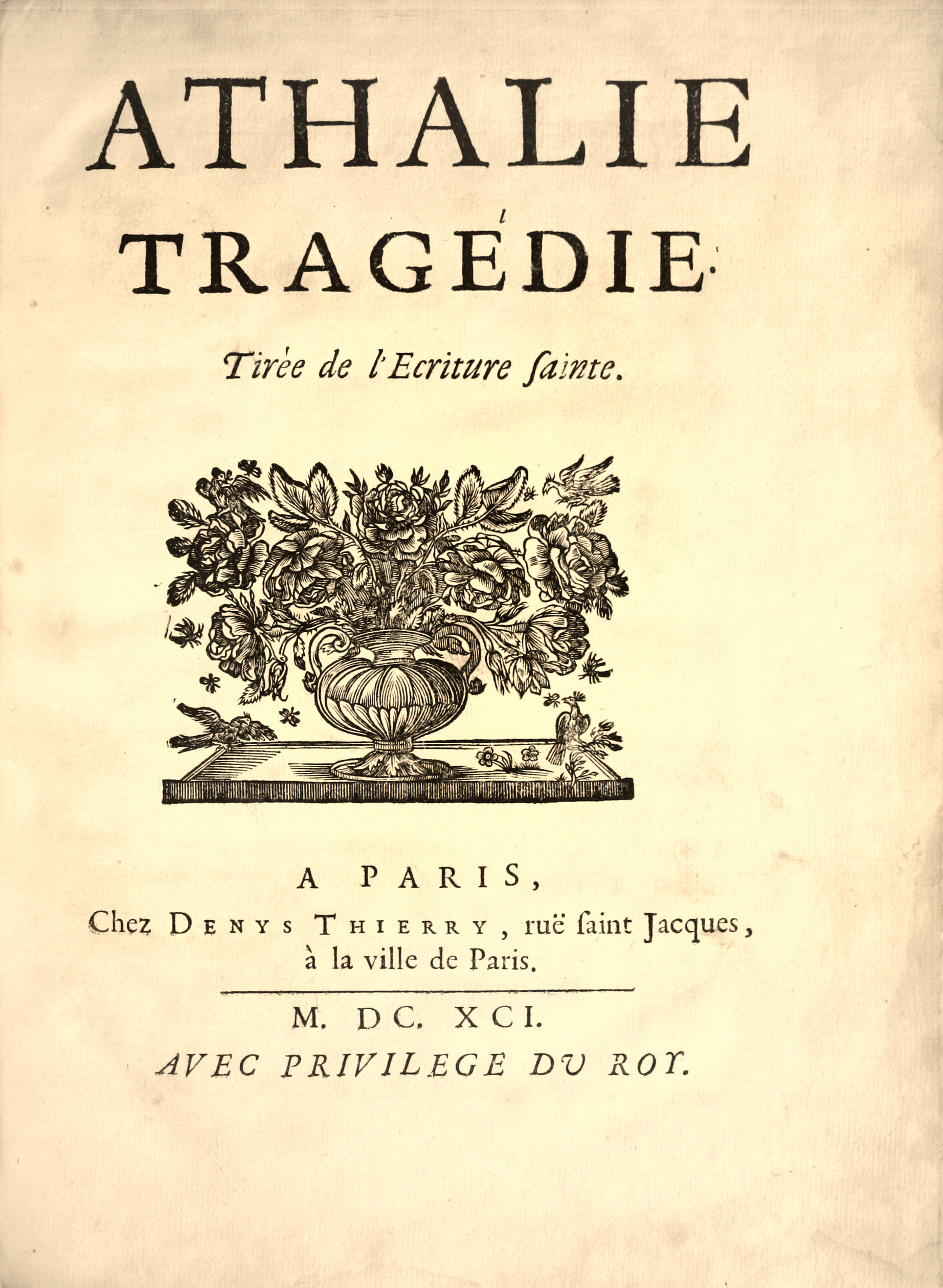 Composed at the request of Louis XIV and Madam de Maintenon, Athalie was first presented by the students of Saint-Cyr, in the greatest simplicity, with no décor or costume, during the months of January and February 1691.