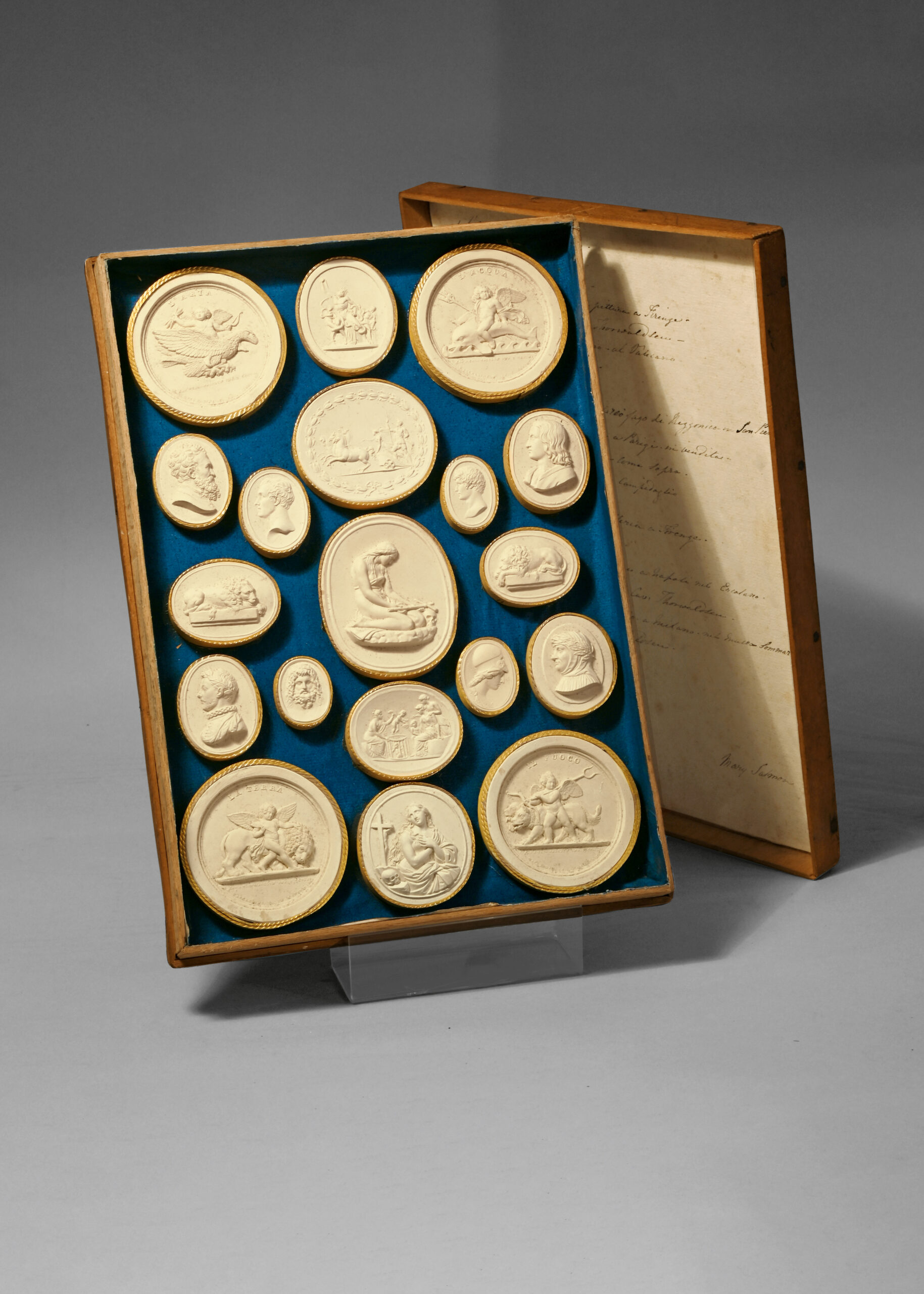 This set of nineteen plaster impressions of intaglios, mainly representing classical subjects, was made in Rome around 1820.