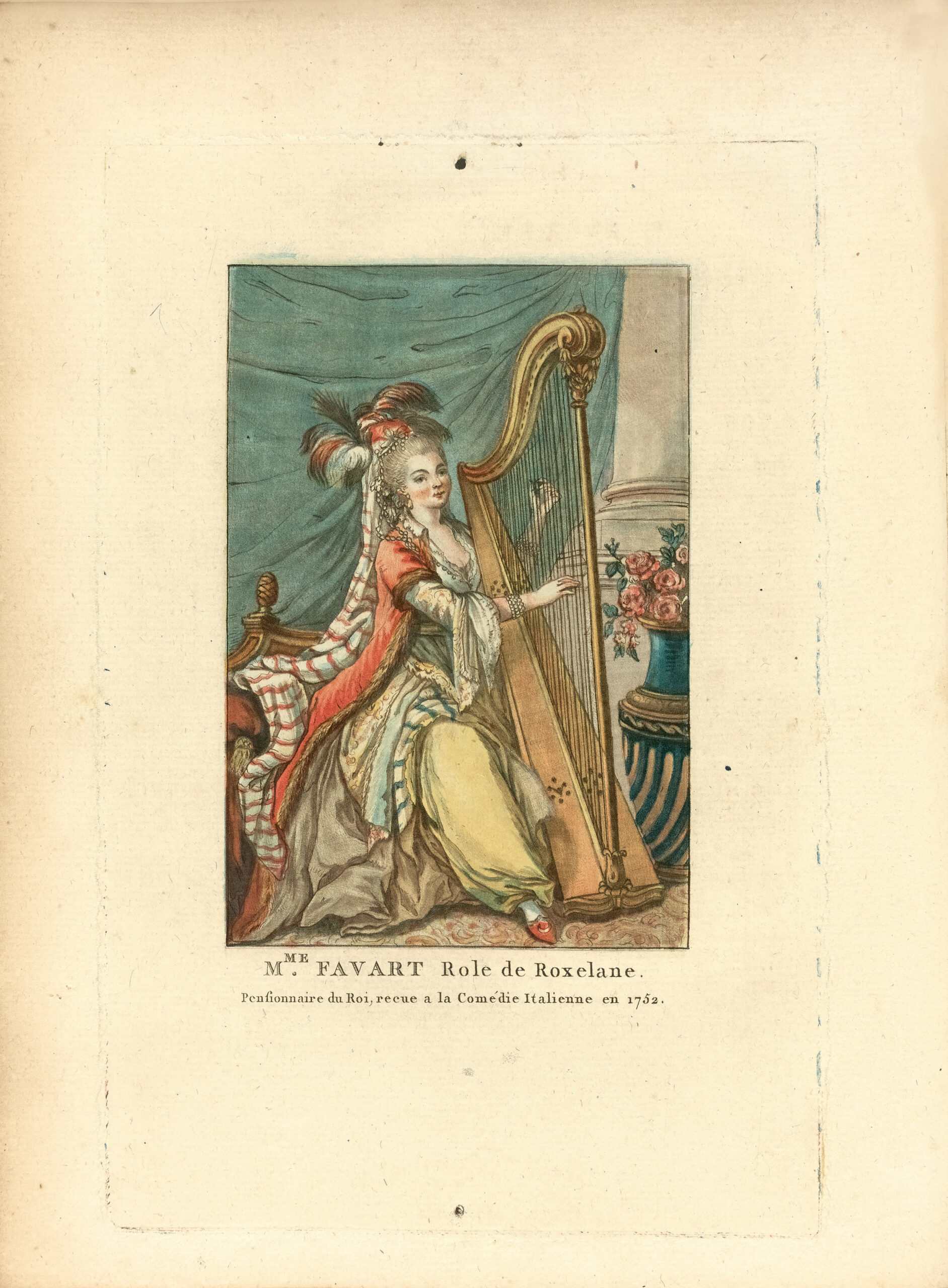 This work, started by Mr. D’Auberteuil and continued by Le Vacher de Charnois, was regularly published from April 15, 1786, to November 8, 1789, when it was voluntarily stopped by Charnois. An interesting collection, sought after for the information it provides on theater, but especially for its lovely portraits of actresses, including Miss Contat (role of Suzanne in ‘The Mad Day’), Mrs Dugazon, Miss Guimard, Miss Colombe, Mrs Vestris, Mrs Favart, Sophie Arnould, Adrienne Lecouvreur, Raucourt, etc.” (Cohen, Guide de l’amateur de livres à gravures du XVIIIe siècle, col.226-227.)