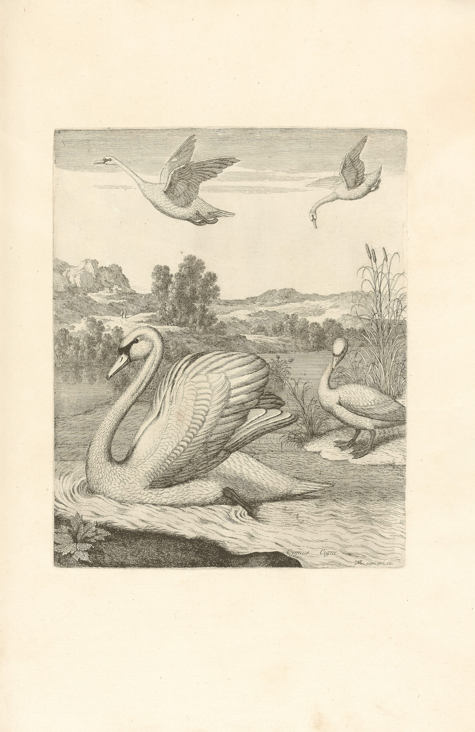 The 31 compositions do, however, show some stylistic differences from the vellum paintings Robert produced for Louis XIV: the subjects are depicted within elaborate landscapes, and most plates include multiple subjects, giving the plates a liveliness that is often lacking in ornithological works.
