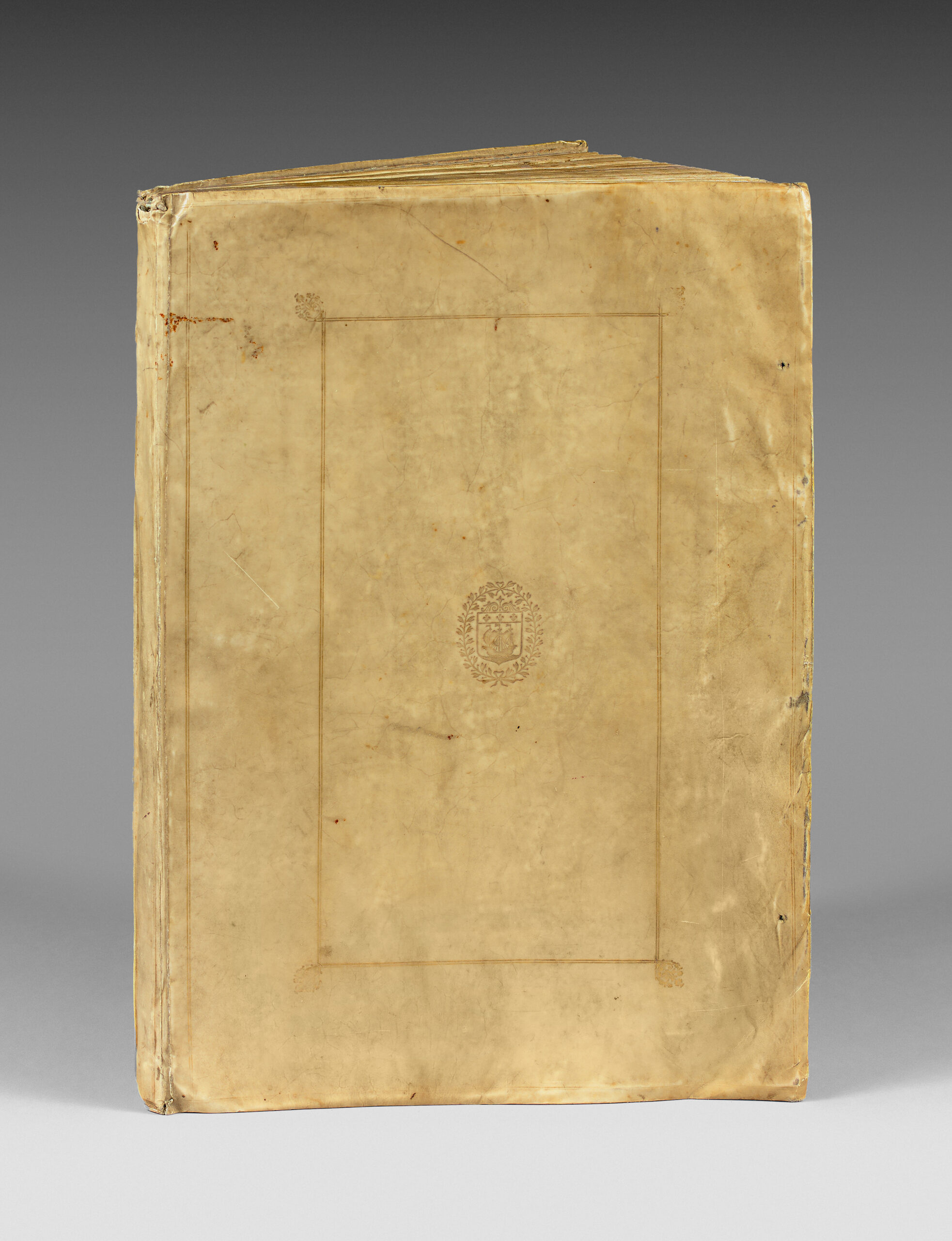 Vellum, double frame of gilt fillets on the boards, arms of the city of Paris stamped in gold at the center, smooth spine ornamented lengthwise with a double gilt fillet frame, gilt edges. Contemporary binding.