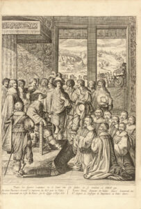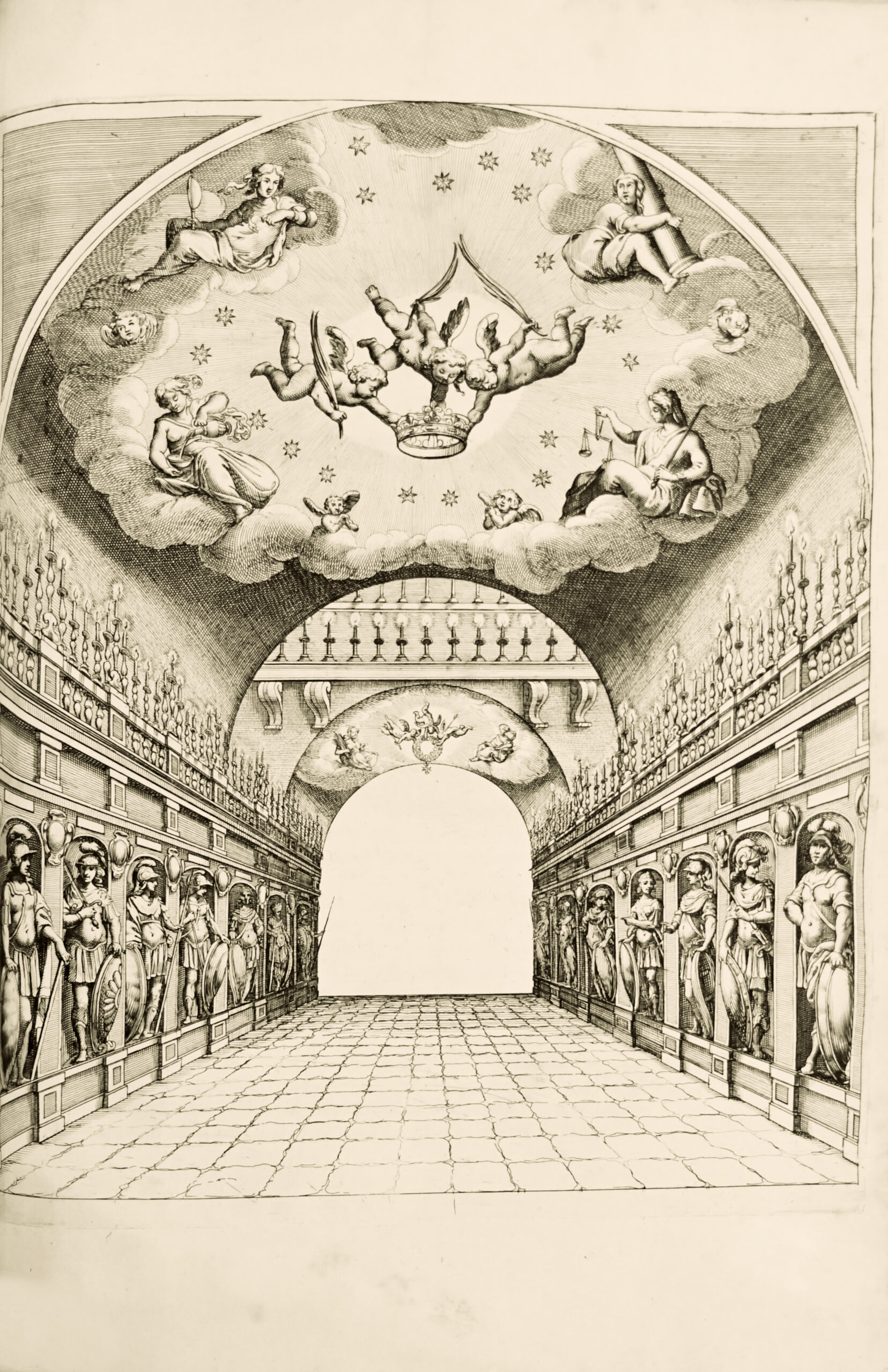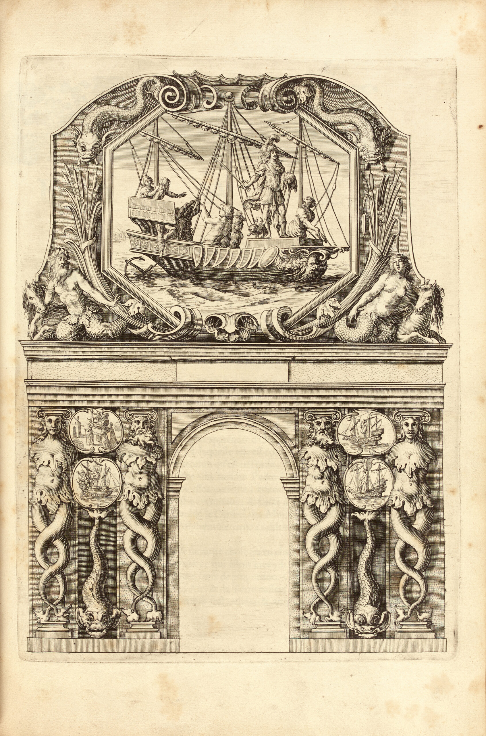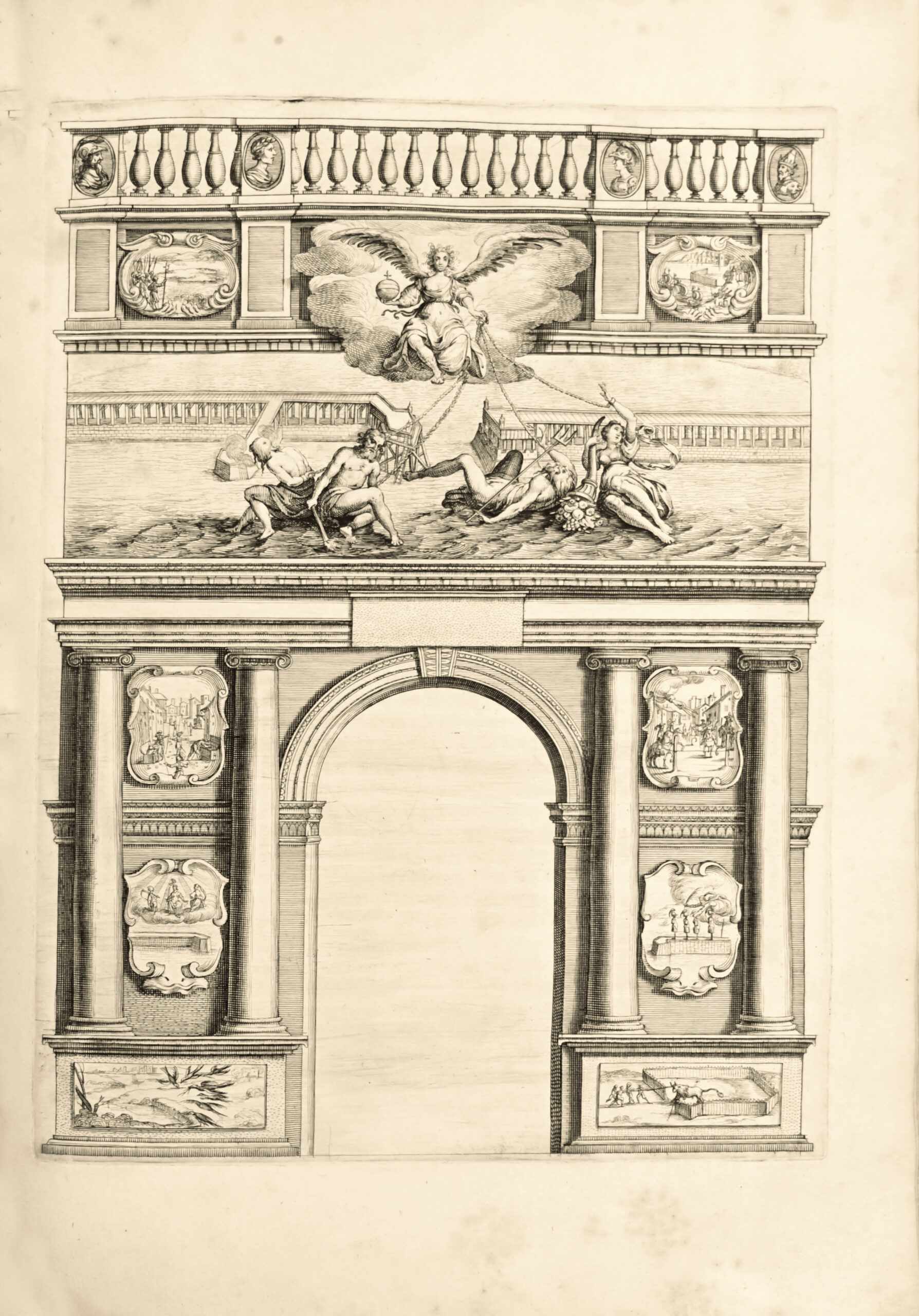 The first 12 depict the twelve triumphal arches erected for the occasion and celebrating the twelve royal qualities: Clemency; Piety; Renown; Love of the people; Justice; the honor of naval battles; Prudence; the Majesty of the King; Strength, dedicated to the King’s exploits; Honor; the Magnificence of the King; the eternity of the King’s Glory.