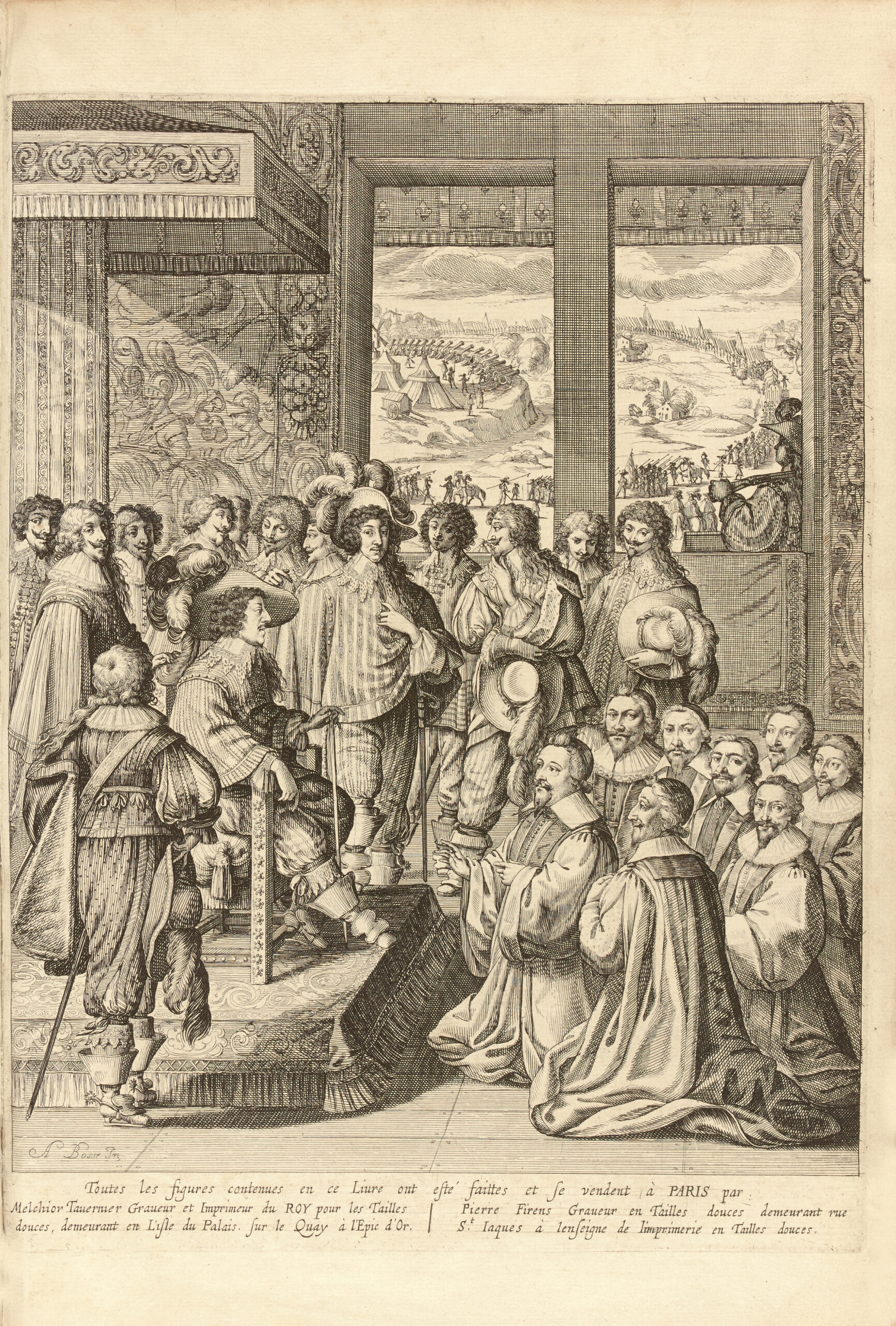 At the head of the work indeed appears the large and beautiful engraving (305 x 230 mm) engraved after a drawing by Abraham Bosse, representing the deputies of La Rochelle at the feet of Louis XIII.
