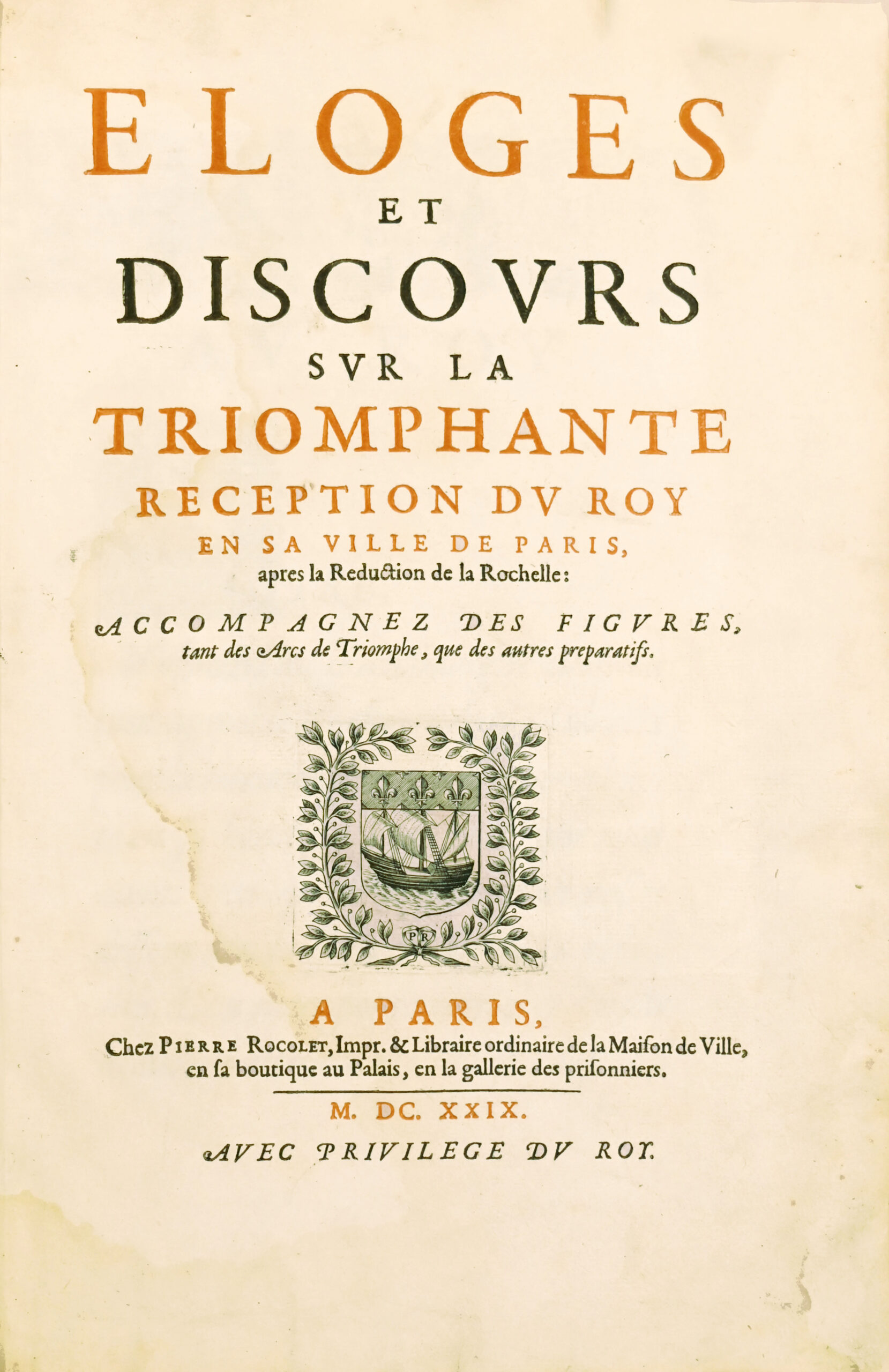 First issue of the sumptuous reception organized in Paris for Louis XIII and of his triumphant entry into his capital after his victory over the Huguenot stronghold of La Rochelle.