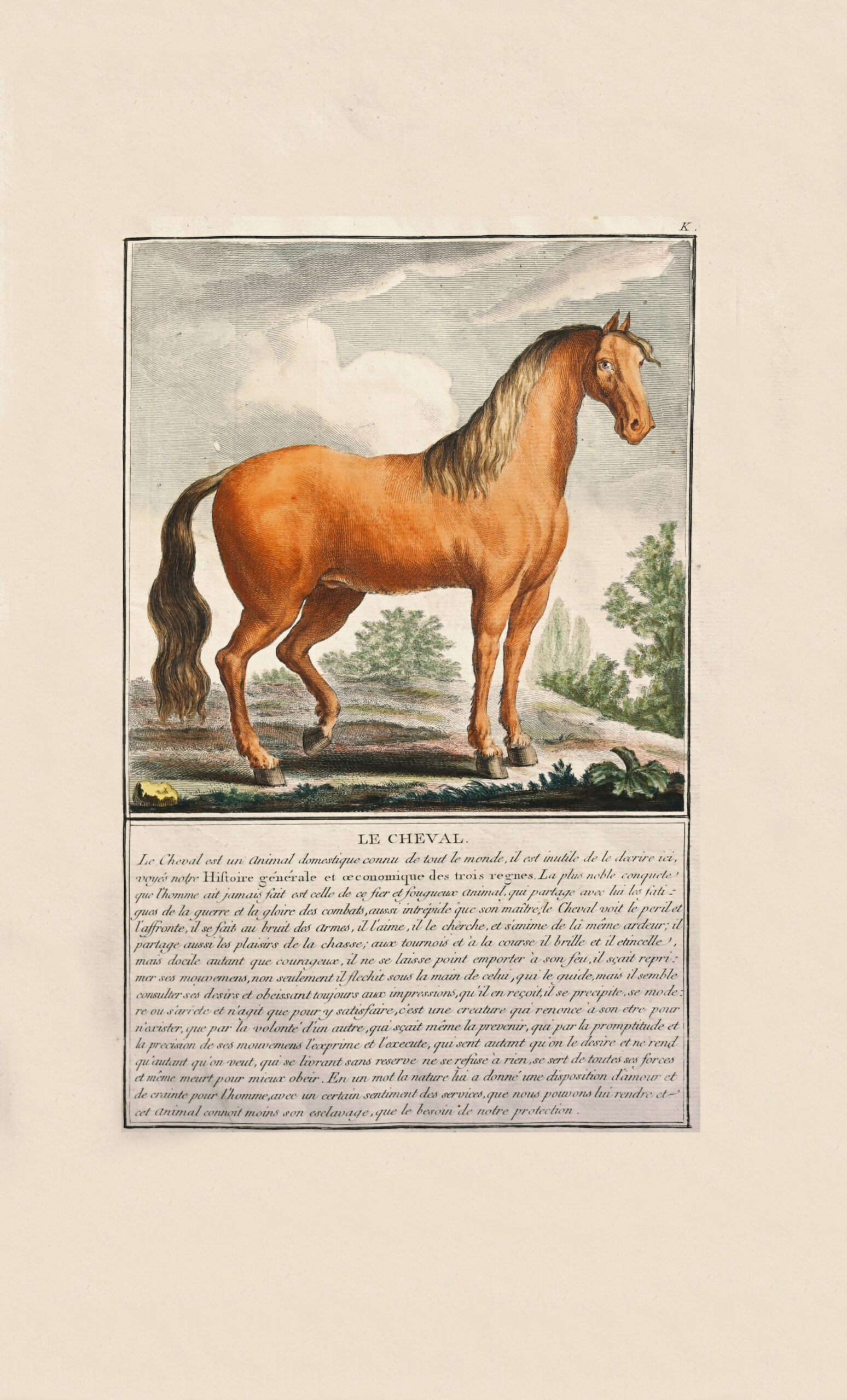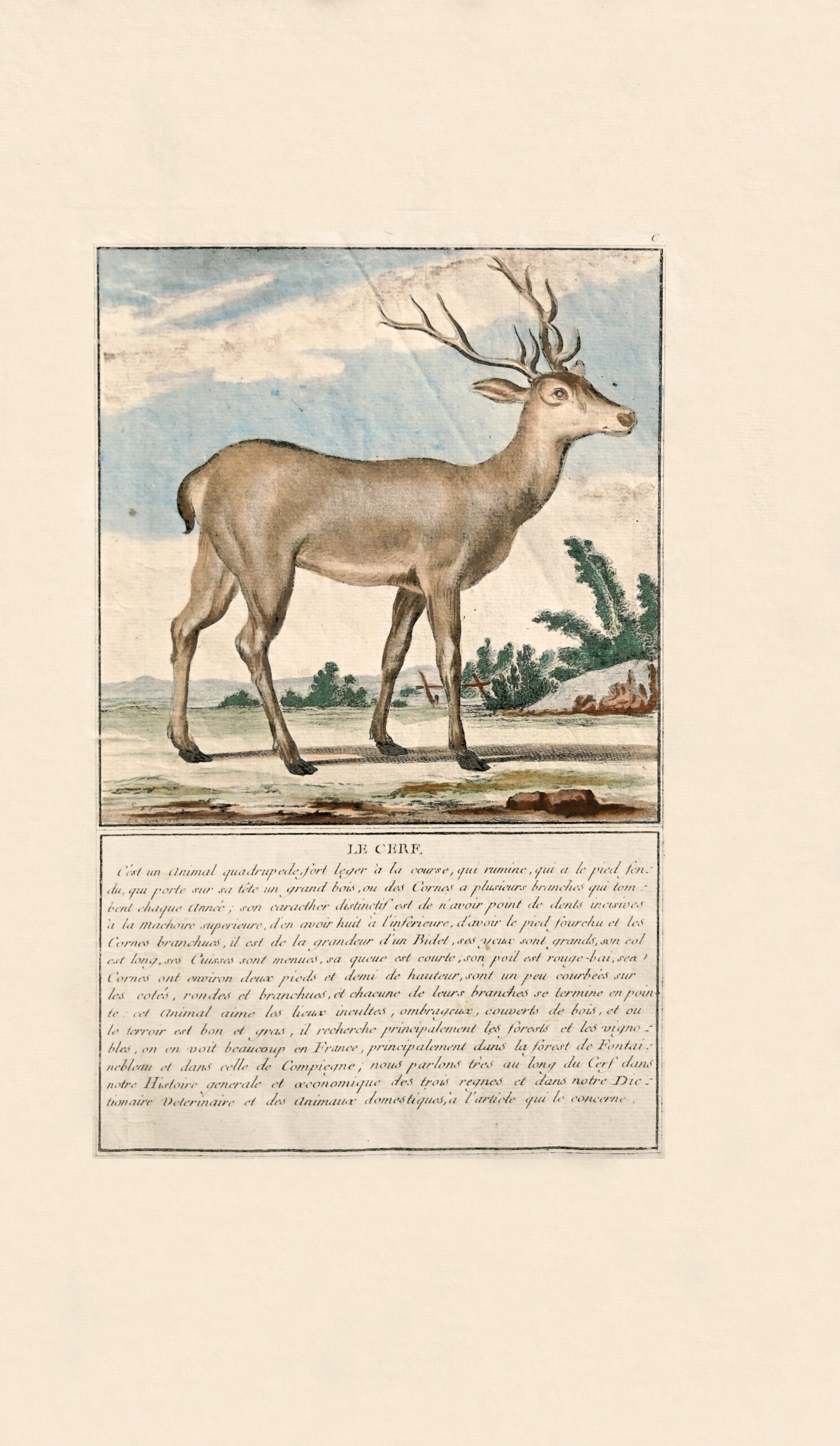 “This first Cahier that we have before us contains ten Plates representing the horse, the donkey, the Cotentin cow, the buck and the goat, the stag, the doe and her fawn, the bear, the bats called horseshoe, and those named Oreillard and Noctule. These engravings seem to us to render nature with great truth. M. Buchoz, one of the most industrious Naturalists who ever existed, frequently gives new proof of his zeal and fecundity through productions that follow one another at quite short intervals: they contain a considerable number of Plates which must have entailed very great expense.