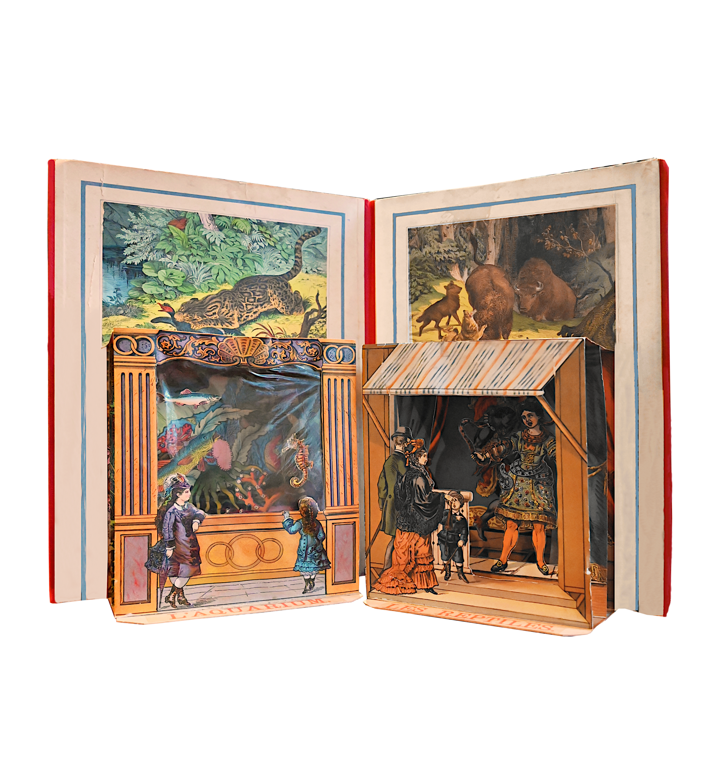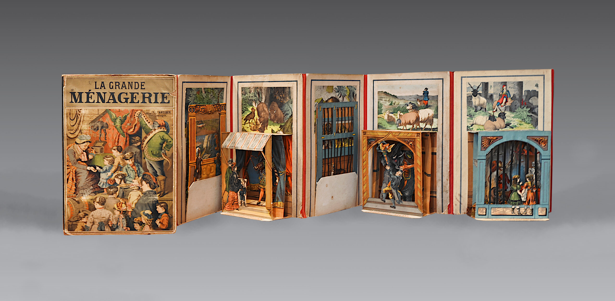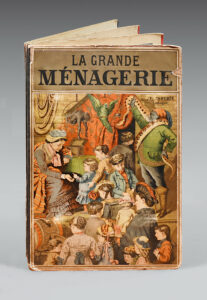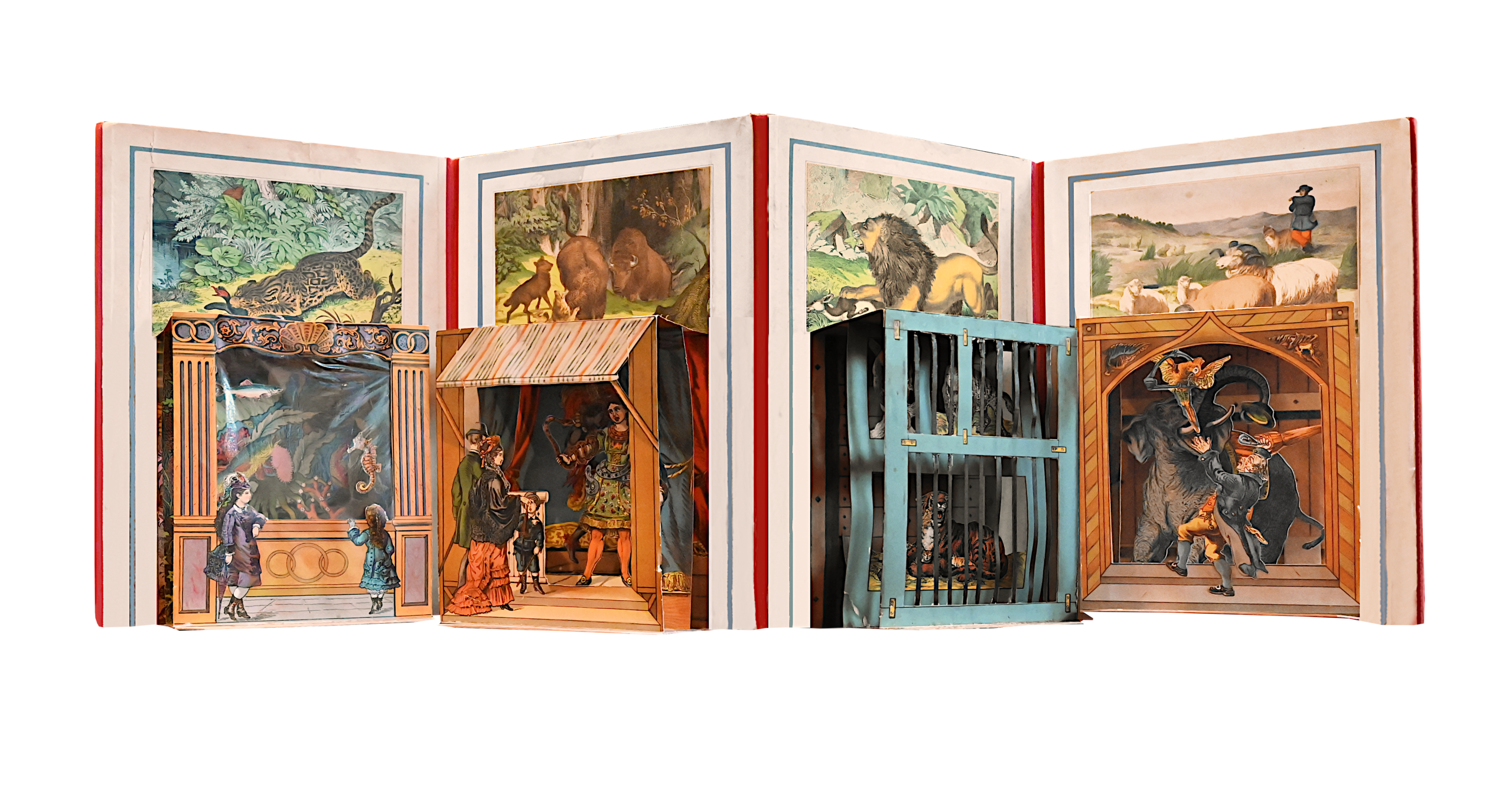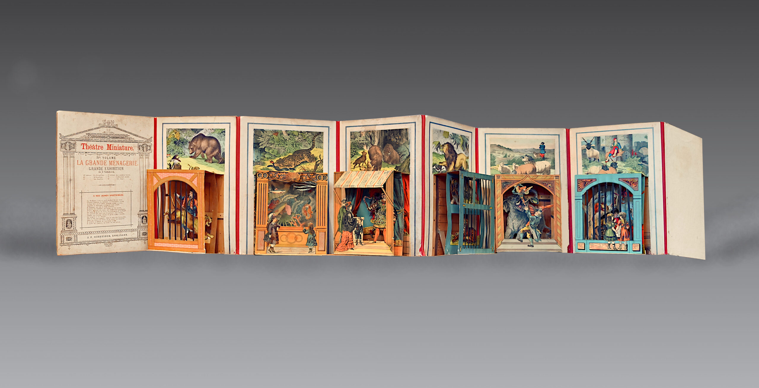 Very rare and superb book with movable parts forming a miniature theater, adorned with 6 folding compositions in pierced panels representing different scenes of a ménagerie.