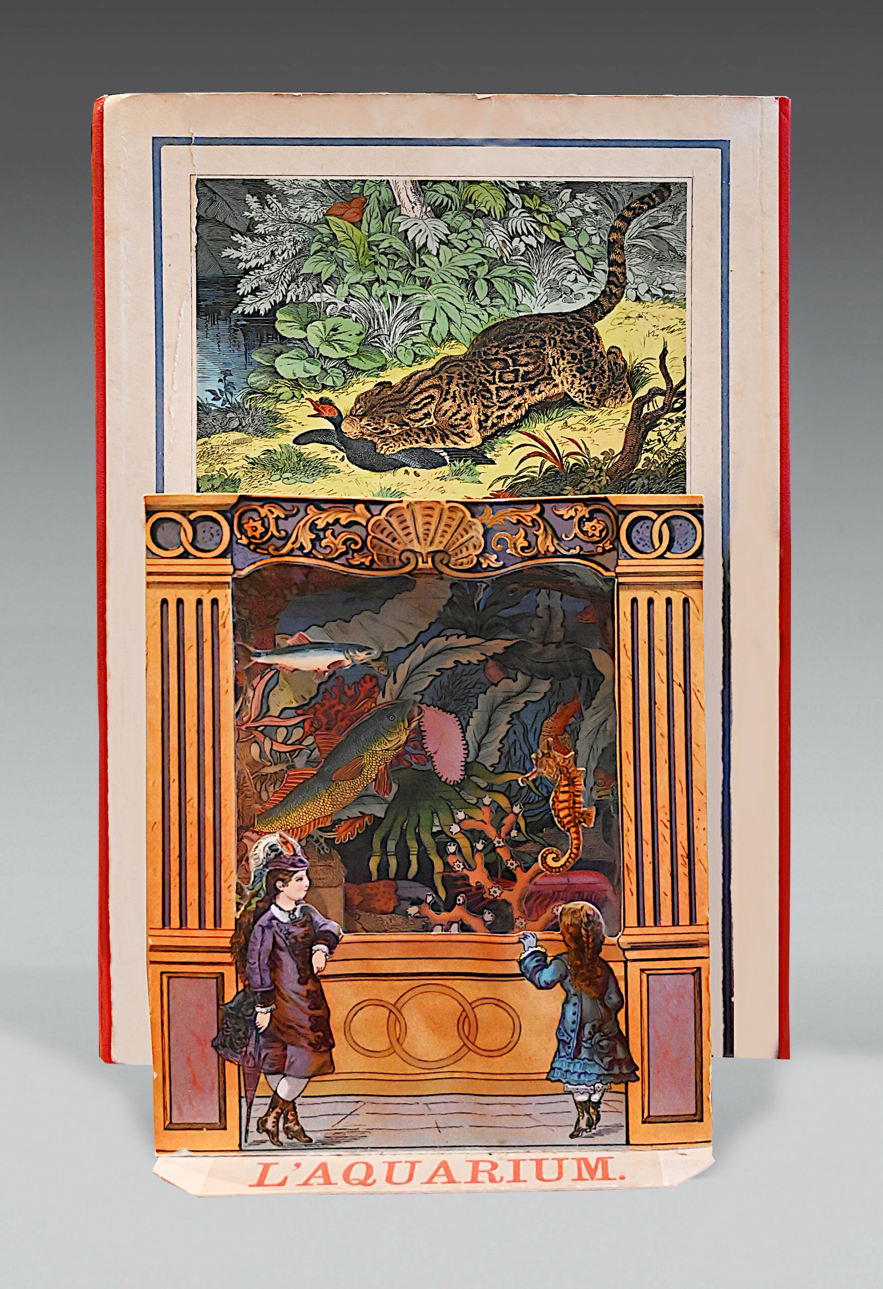 4to unfolding into 8 leaves, 6 of which are pop-up type. Half red cloth, chromolithograph on the upper cover, some small restorations, small paper losses on the upper cover. Publisher’s binding.