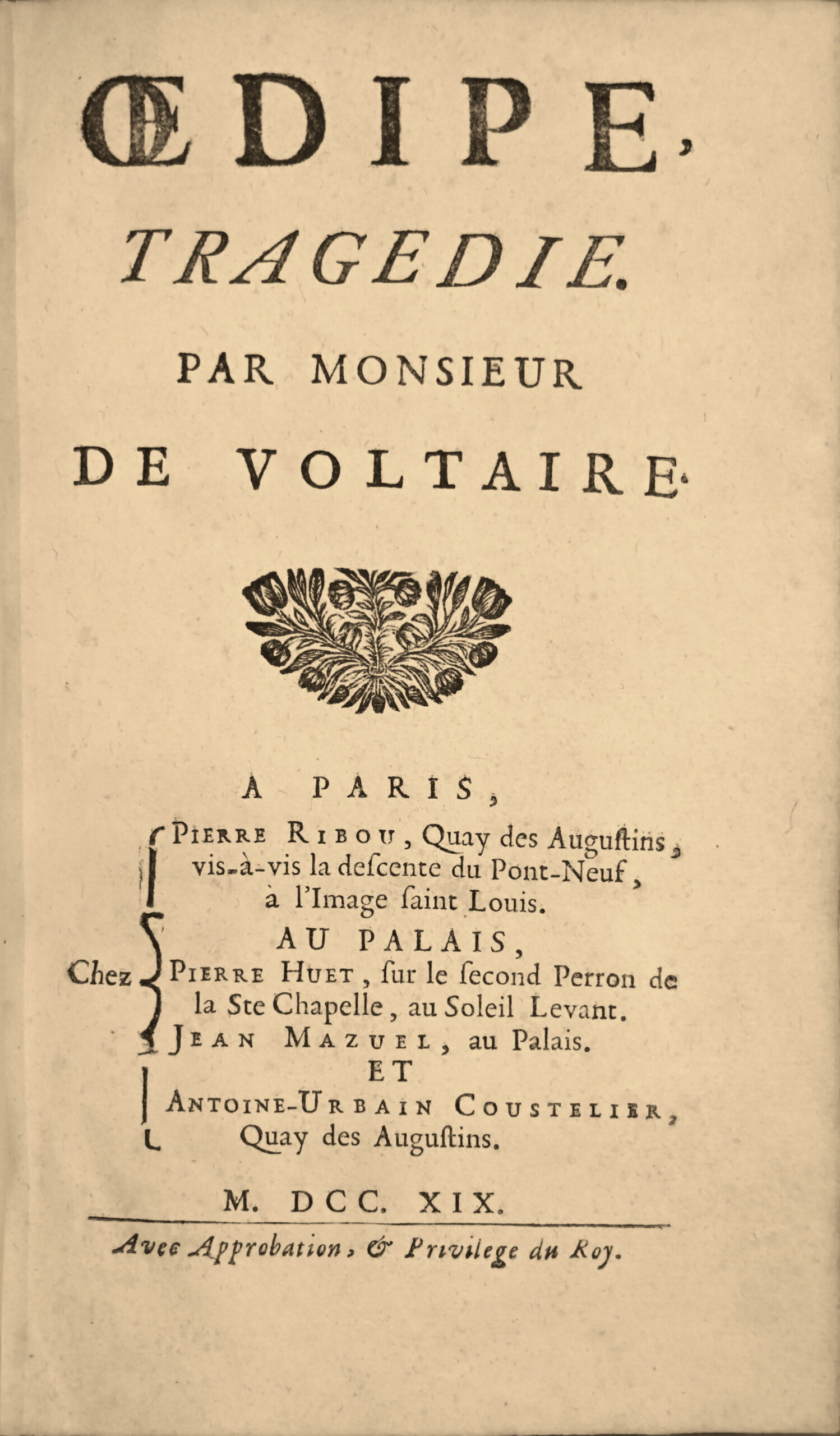 First work by Voltaire, this tragedy appeared during Voltaire’s first exile at Châtenay. It was received with extreme favor and marks the beginning of the author’s success in his theatrical career.