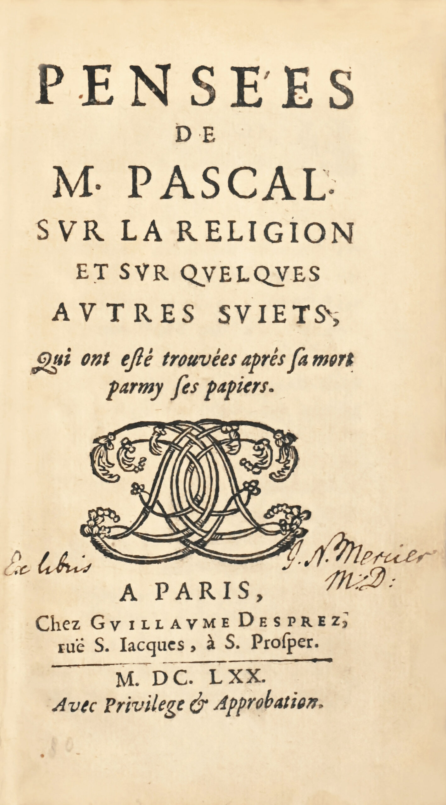 Los ejemplares de los «Pensamientos» de Pascal impresos en 1670 encuadernados en marroquín de la época son raros; uno perteneciente a la primera edición original de 1670 fue vendido por 230 000 € por Sotheby’s hace 16 años (Sotheby’s, 5 de diciembre de 2001); el segundo, proveniente de la biblioteca Pierre Bérès, corto de márgenes y restaurado, fue vendido por 120 000 € hace 12 años. Precioso ejemplar encuadernado en marroquín decorado de la época con un soberbio origen: « El abad de St André – Colegio del Plessis-Sorbonne – este 21 de marzo de 1698 »