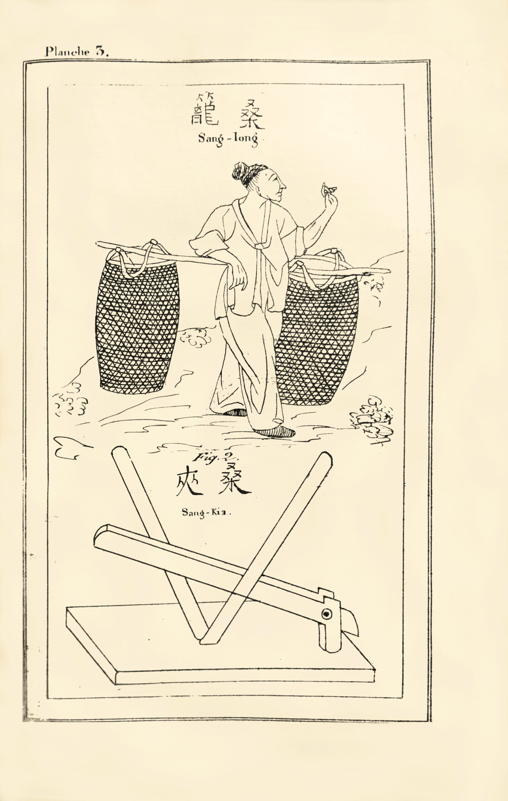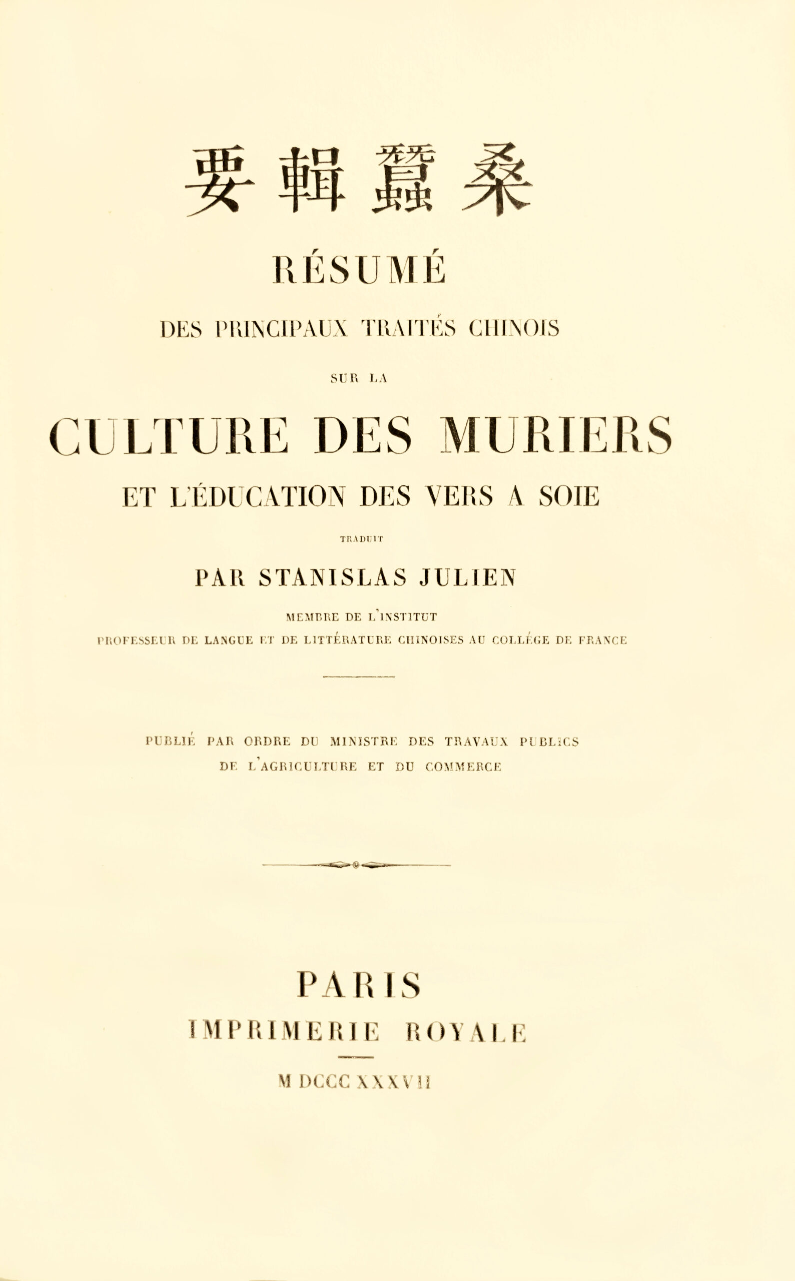 이런 연구는 1837년에 스타니슬라스 쥘리앵에 의해 출판된 뽕나무 재배와 누에 교육에 관한 주요 중국 논문 요약, 한 번 출판되자마자 여러 유럽 언어로 번역된 작품으로 절정에 달했습니다.