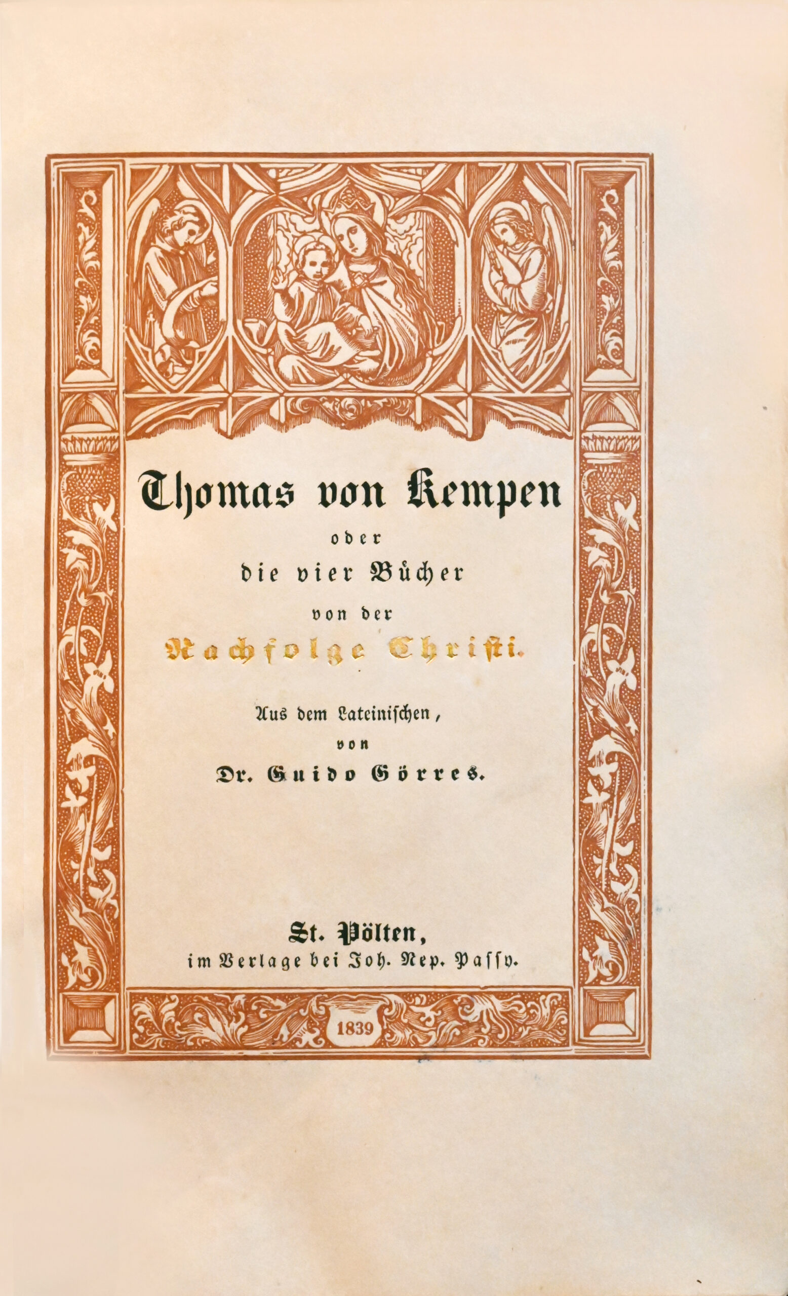 Die vier Bücher von der Nachfolge Christi. Aus dem Lateinischen, von Guido Görres. (Les quatre livres de l’Imitation de Jésus-Christ. Traduit du latin par Guido Görres).