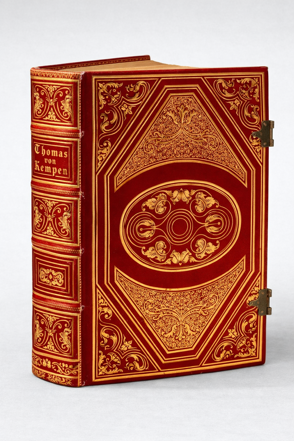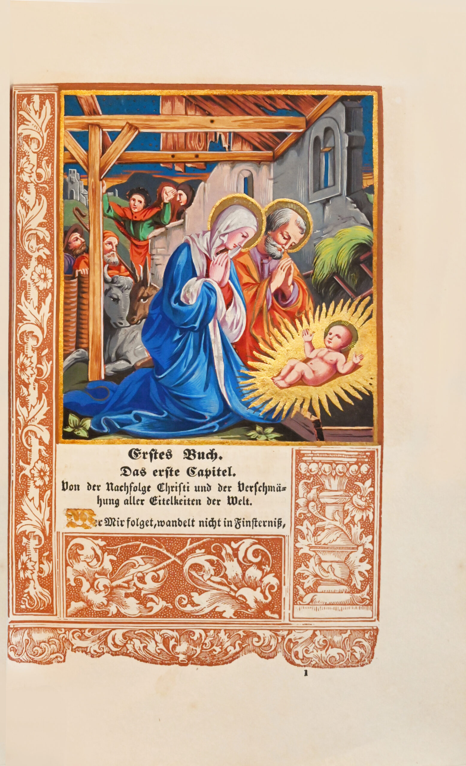Il s'agit du livre le plus imprimé au monde après la Bible. Superbe exemplaire de l’Imitation de Jésus-Christ dont les miniatures ont été peintes à la main à l’époque dans des teintes éclatantes et rehaussées à l’or.