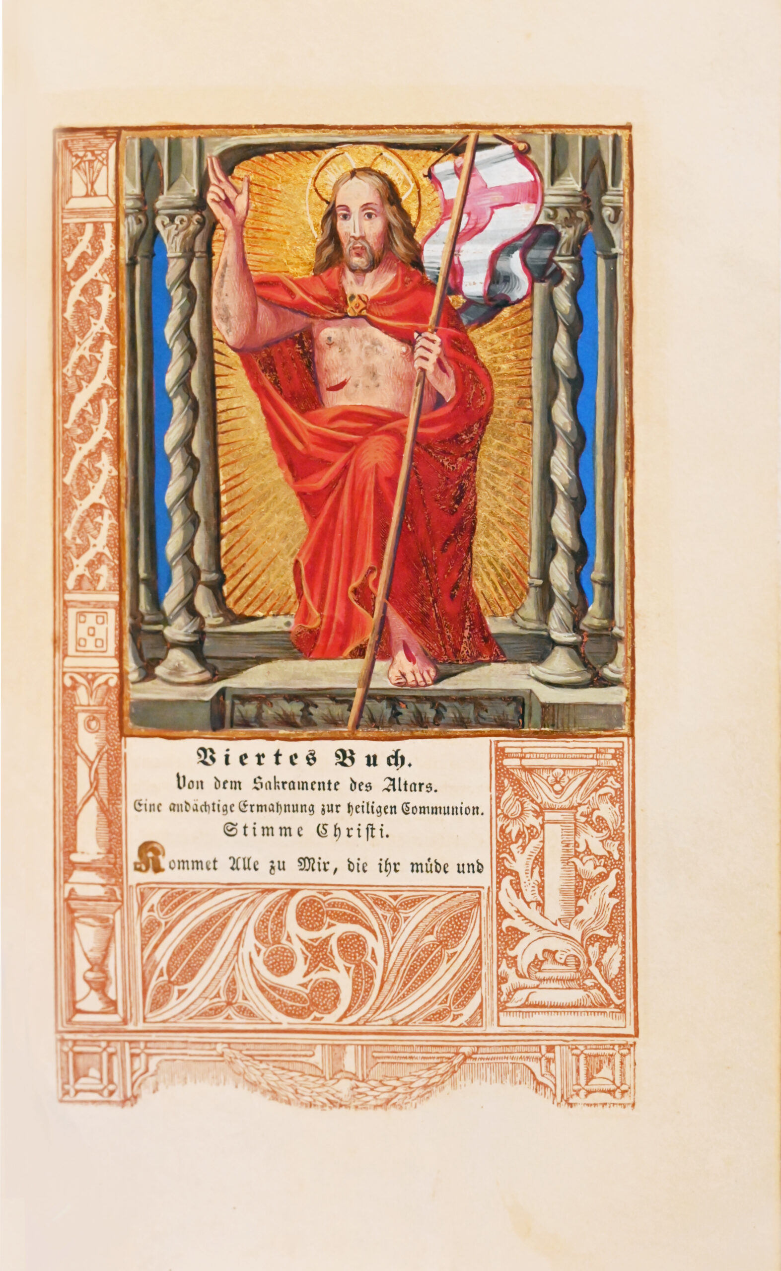 In-8 de 186 feuillets. Avec 5 miniatures polychromes rehaussées d’or protégées par des serpentes en soie, toutes les pages (sauf les deux derniers feuillets) encadrées de bordures figuratives en sépia d’après Eduard Jakob von Steinle, avec des initiales figuratives imprimées en noir, certaines parties du titre et les initiales sont imprimées en doré. Le feuillet de garde comporte une note manuscrite