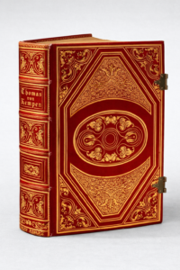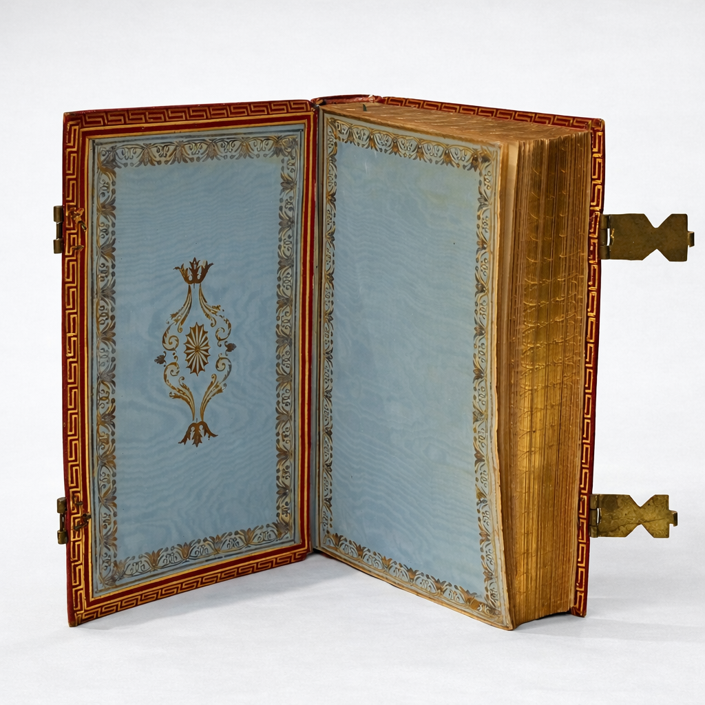 Reliure en cuir rouge gaufré sur ais de bois avec riche décor sur le dos et les plats, 2 fermoirs métalliques, tranches dorées ciselées, gardes en soie bleu clair décorées. Reliure de l’époque.