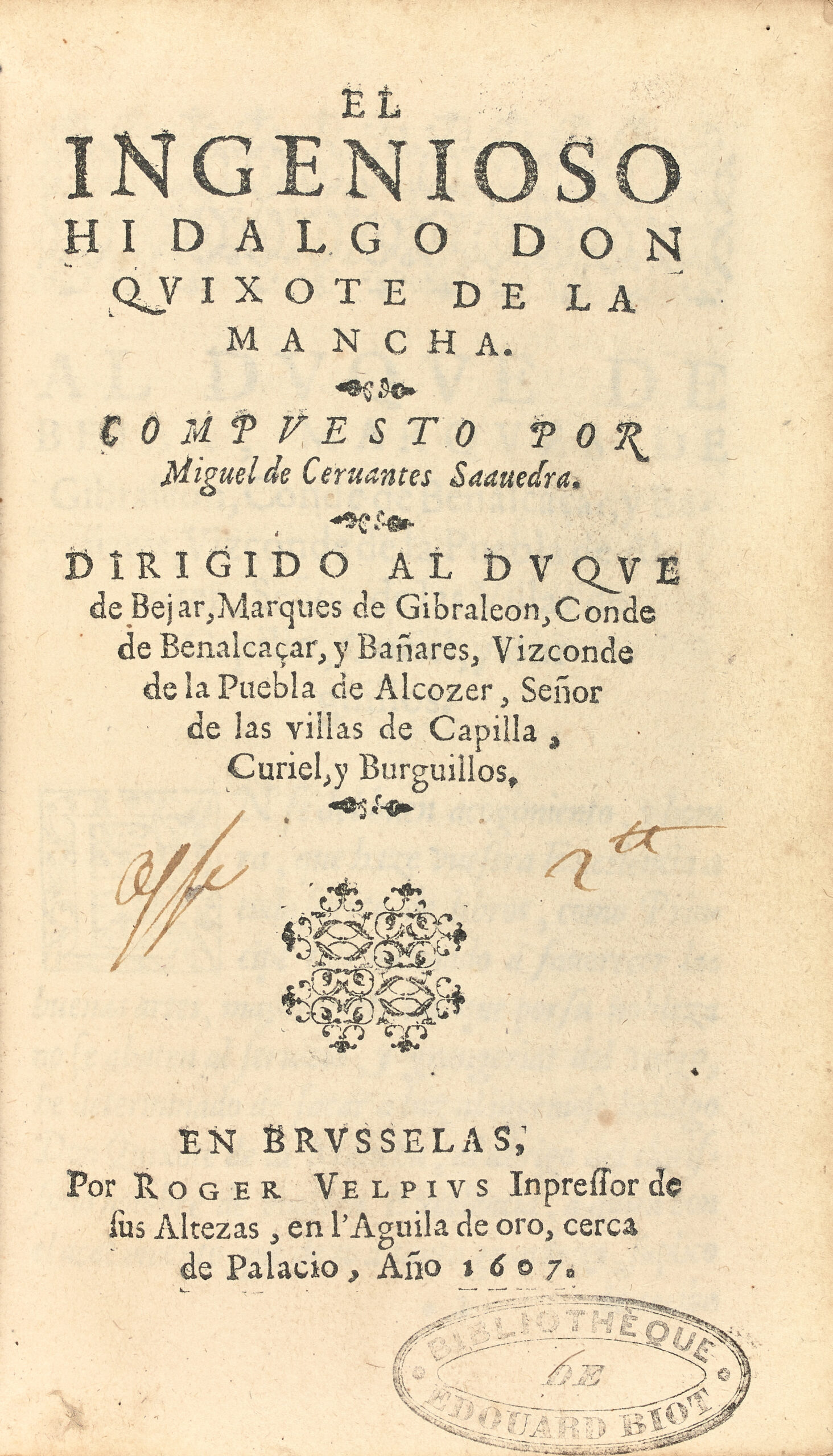Première édition bruxelloise publiée deux ans après l’originale madrilène, qui fut suivie la même année d’une nouvelle édition chez son éditeur, Juan de la Cuesta, de deux réimpressions à Lisbonne, une à Madrid à nouveau, et deux à Valence ; et la nôtre qui suit le texte de de la Cuesta, ajoutant de nombreuses et sages corrections, en particulier les corrections qui figuraient aux chapitres XXIII et XXV (passage de Sancho sur son âne, après que Pasamonte le lui eut volé), ainsi que la très heureuse transposition des paragraphes des chapitres XXXV et XXXVI, inversés dans les éditions de de la Cuesta.