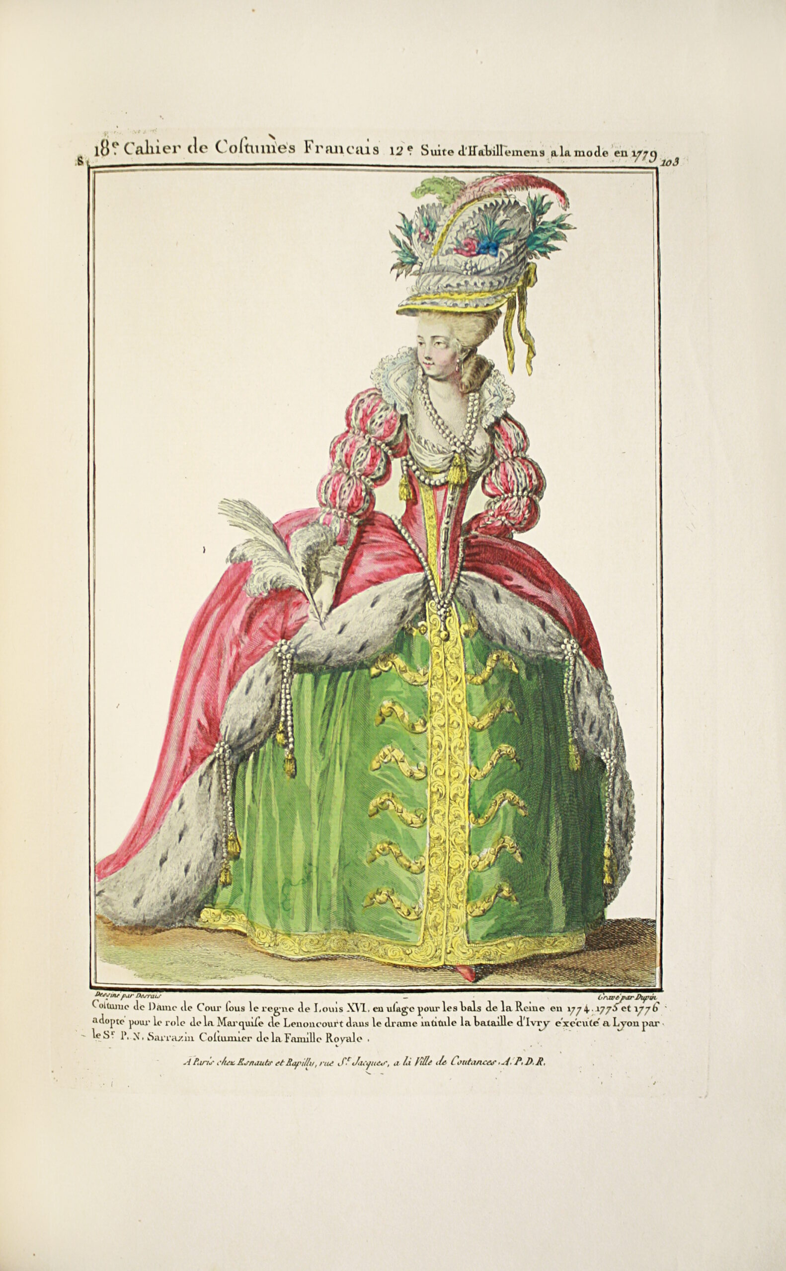 Costumes de cours, de ville, ou de théâtre, souvent très longuement décrits, avec le nom de leur costumier (aujourd’hui certains disent « créateur ») ou le nom de l’acteur et de la pièce (par exemple, le Barbier de Séville, Athalie). Chaque planche est précédée d’un feuillet de papier en vergé en guise de serpente à décharge (filigrane : O. Ouvrard / Enmarche / 1778).