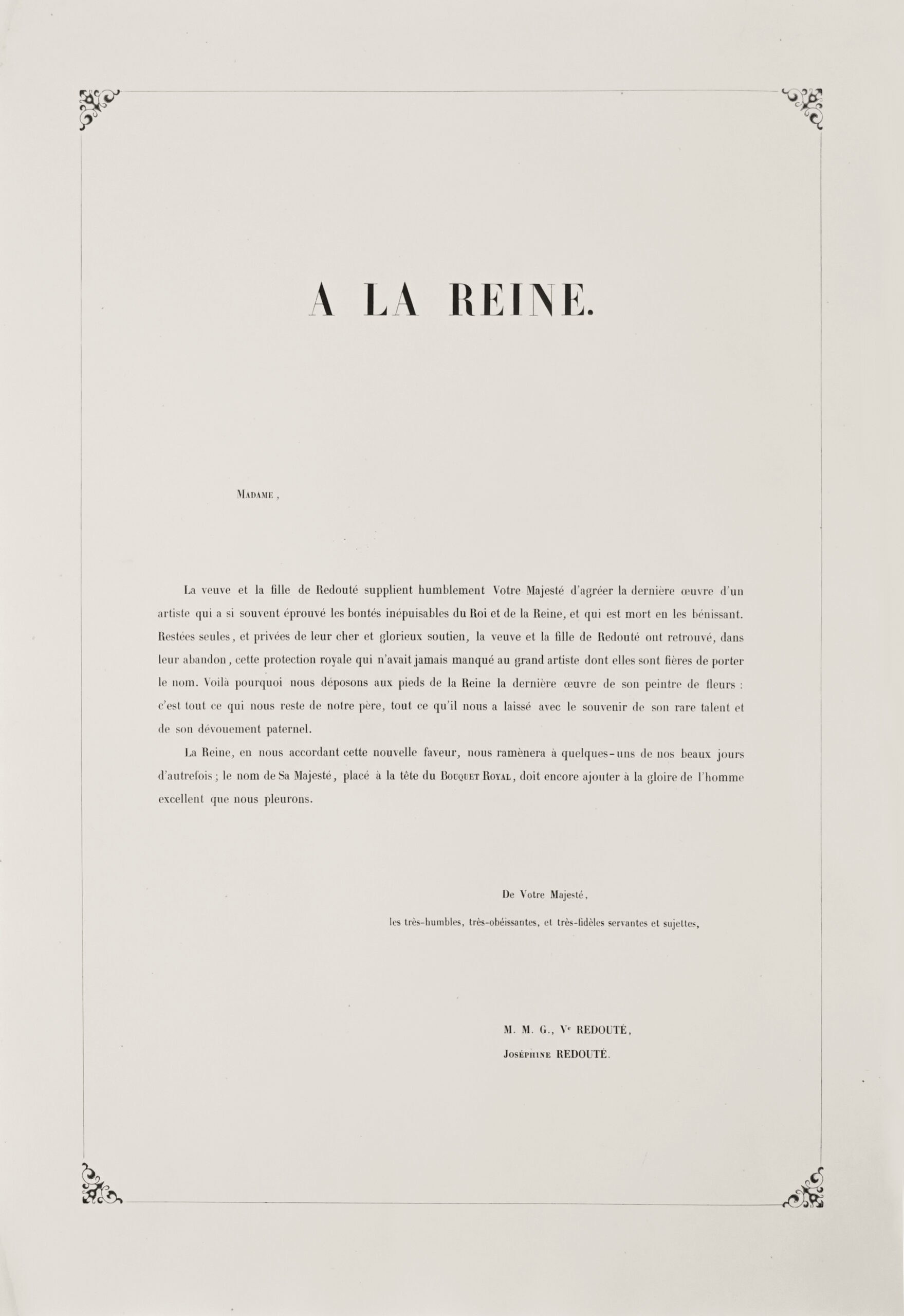 « Le dernier travail de Redouté fut un choix de quelques roses, publié depuis sa mort, sous le titre de ‘Bouquet royal’ et dédié, par sa veuve Marthe Gobert, à la famille régnante de France. »
