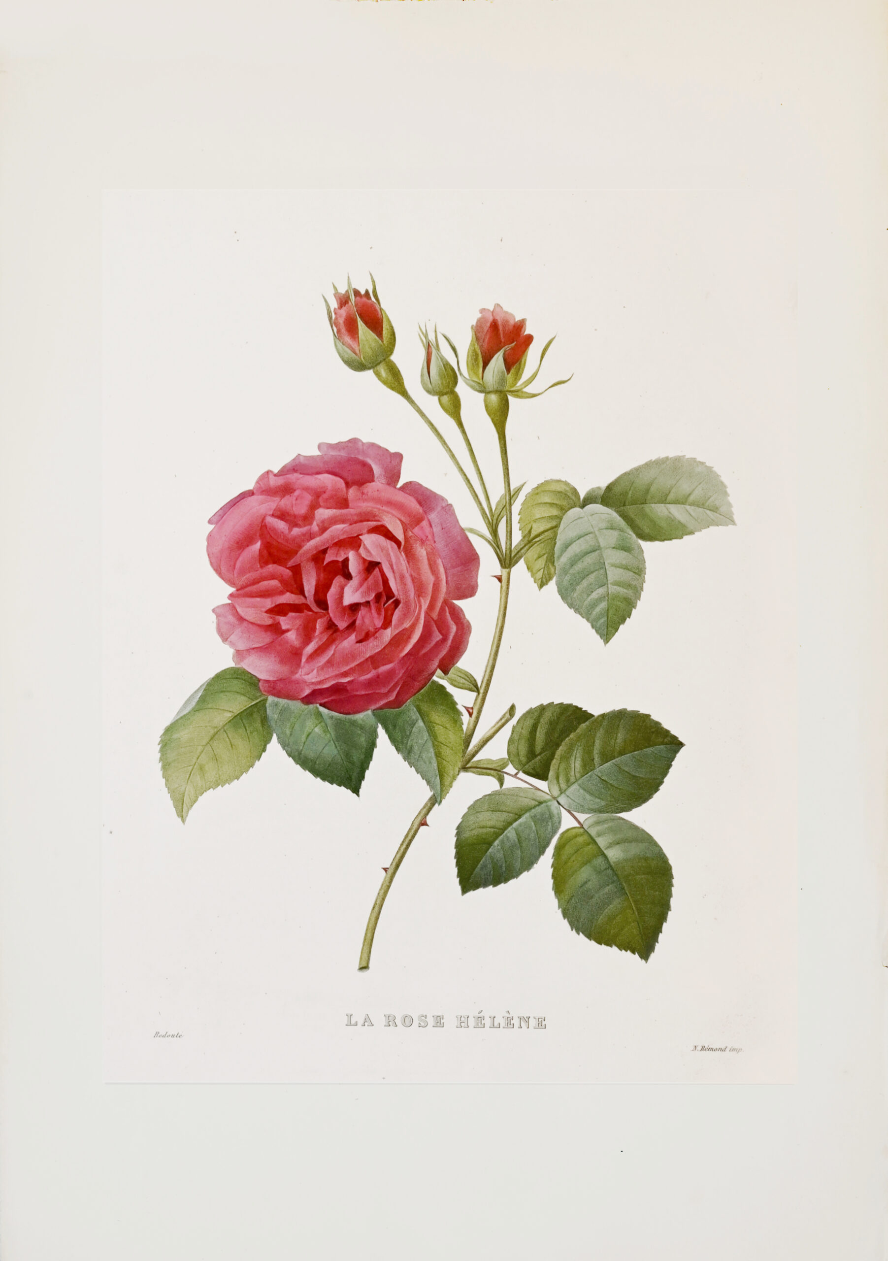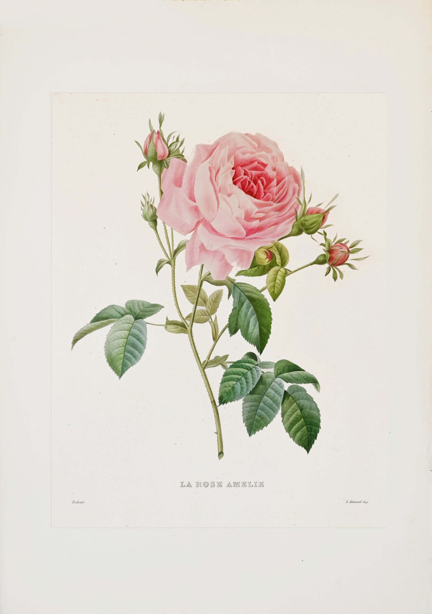 « Le « Bouquet » contient des gravures coloriées à la main de quatre roses non incluses dans sa magistrale monographie sur la fleur – la rose Clémentine, la rose Amélie, la rose Adélaïde et la rose Hélène – ainsi qu’un portrait de Redouté lithographié par François-Forunte-Antoine Ferogio d’après Marie Eléonore Godefory. »