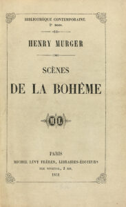« Roman d’Henri Murger (1822-1861). Il est composé en grande partie par des articles parus en 1847 dans un journal très modeste ‘Le Corsaire’, dont Murger était un des rédacteurs. Les chapitres n’ont aucun lien apparent entre eux ; ils ne sont, comme d’ailleurs l’indique le titre du livre, que des ‘scènes de la vie de bohème’, de la véritable ‘bohème’. En effet, l’auteur, dans sa préface, s’attache à la distinguer de toutes les autres formes d’existence vagabonde qu’on a l’habitude d’appeler de ce nom. Selon Murger, la ‘bohème’ est cette première forme d’existence à travers laquelle doivent passer tous les artistes et les hommes de lettres, avant d’atteindre une renommée bien assise (‘La Bohème, c’est le stage de la vie artistique. C’est la préface de l’Académie, de l’Hôtel-Dieu ou de la Morgue’). Les personnages principaux du livre sont le musicien Schaunard, le poète Rodolphe, le peintre Marcel, le philosophe Colline : s’étant rencontrés par hasard, au moment où ils étaient tous dans une situation matérielle difficile, ils décident de constituer une sorte d’association en vue d’affronter ensemble des événements agréables ou pénibles de leur vie vagabonde […].