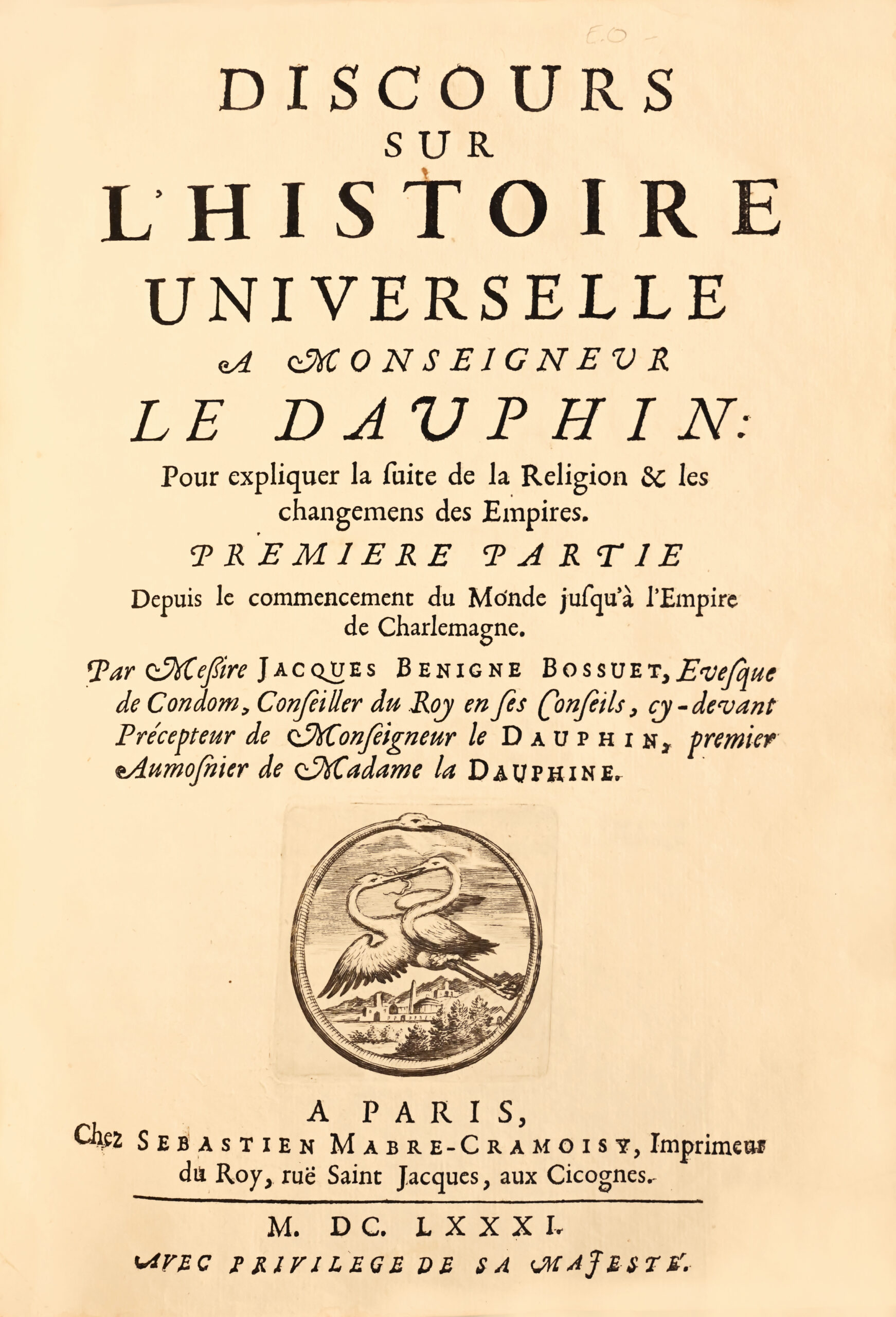 在第一部分中,作者力图按时间顺序概括当时世界上主要事件。在第二部分中,他讨论基督教:颂扬其进步过程,展示了它如何由摩西准备,最终实现教会的胜利。在最后部分,他研究古代帝国:它们繁荣和衰落的原因,互相之间的缓慢毁灭,以及最终由罗马人统一——这有助于福音的传播。« 《世界历史演说》为作者赢得了极高的荣誉,因为它让我们得以欣赏他天才的不可思议的资源。这不仅仅是因为他充满对比的风格使他成为我们最伟大的散文家之一,更因为作品的内容:信息的丰富与构思的宏伟齐名。再加上对分析的把握。因此,除去目标和手段不谈,博叙埃在此显现为孟德斯鸠的先驱者 ».珍贵的版本,边缘宽广,保存于当时的金黄光滑小牛皮初装订中。来源: F.A.P.德丰特奈, 索芒, 诺伊隆领主,奥唐审判长及布尔日首席法官的藏书室 (1770年版画书签)。