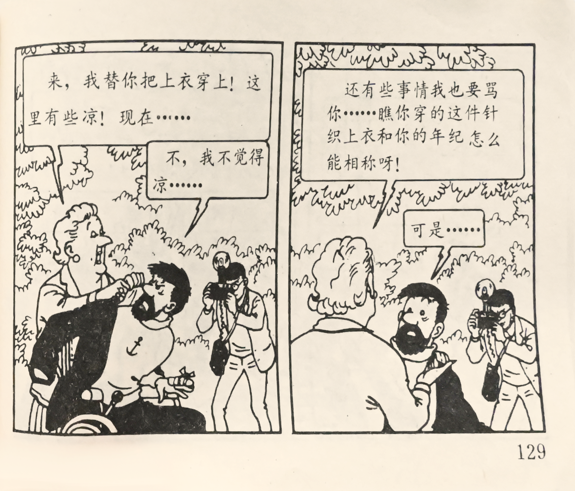 在埃尔热去世后,未经授权,文联出版社在中华人民共和国推出了丁丁的这套盗版重印本。相较于原版,这些专辑采用了完全不同的格式并进行了全新绘制。1984年首次推出 丁丁在刚果, 丁丁在美洲, 蓝莲花, 红色拉克姆的宝藏, 奔向月球 et 714航班 飞往悉尼。在1986年,专辑 金钳螃蟹 的标题被译成了解释性短语: 利用金钳螃蟹进行毒品交易的团伙被捕的故事。1987年, 目的地月球事件 第二卷中出现了一个严重的印刷错误:一页接一页地,故事回到了第一卷的内容。